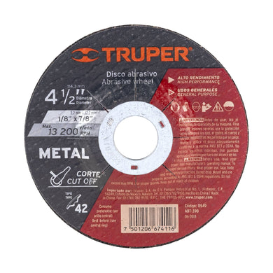Disco corte metal, tipo42, diámetro 4-1/2', alto rendimiento