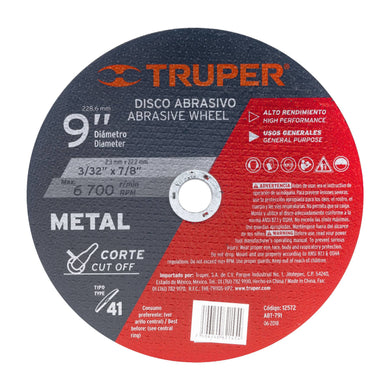 Disco p/corte de metal, tipo 41, diámetro 9', usos generales