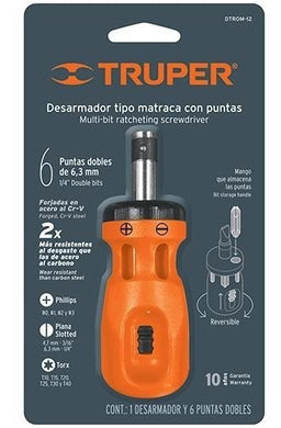 Desarmador tipo trompo con matraca, 6 puntas dobles, blister