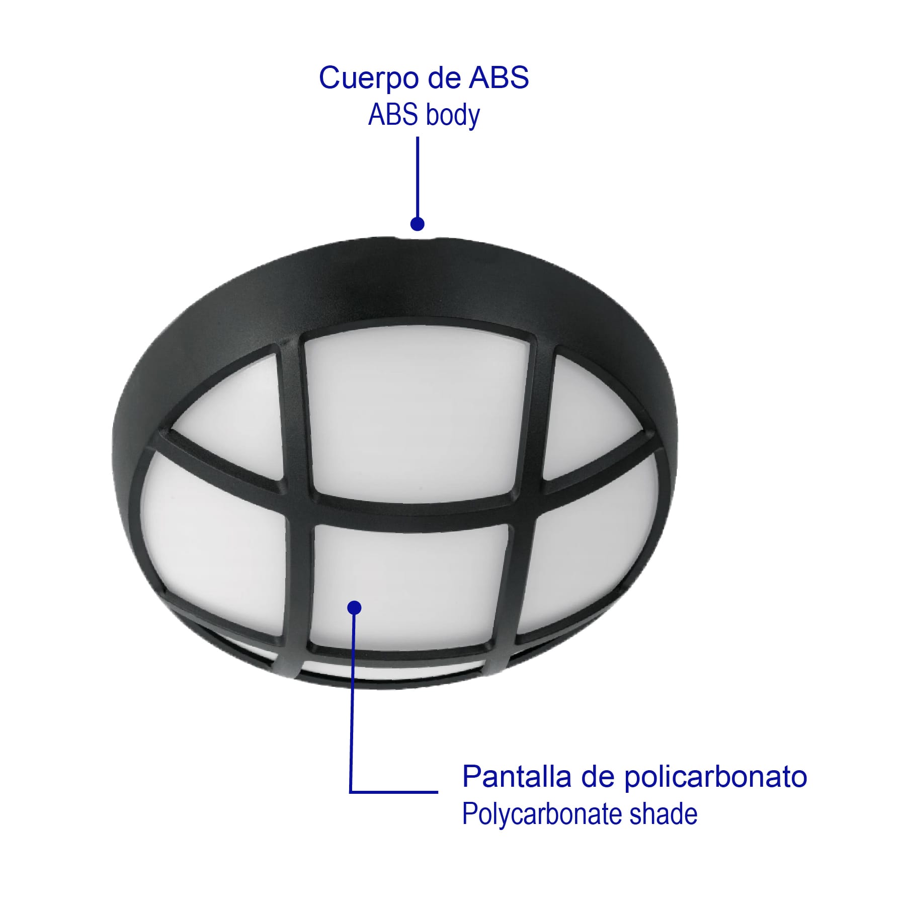 Consumo 14 W Flujo luminoso 850 lm Tensión / Frecuencia 127 V / 60 Hz Corriente 126 mA Acabado Negro Tiempo de vida 30 000 h Temperatura de color 6 500 K / Luz de día Tipo de fuente de luz LED integrado x 84 Grado IP 54 Forma de instalación Pared Dimensiones (Diámetro x ancho) 26 cm x 9 cm Tipo empaque Caja Inner 1 Master 16 Pallet 192 Certificaciones y garantías