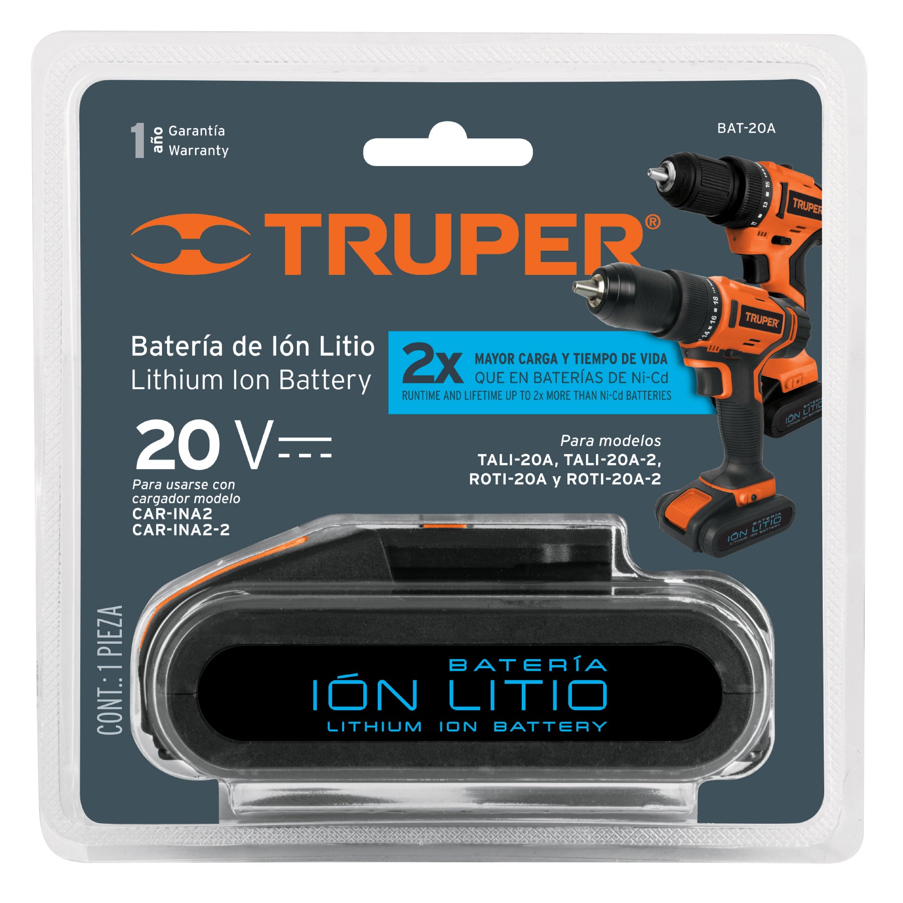 - Para usarse con taladro inalámbrico modelo TAL-18A2, rotomartillo inalámbrico ROTI-18A2 marca Truper®.