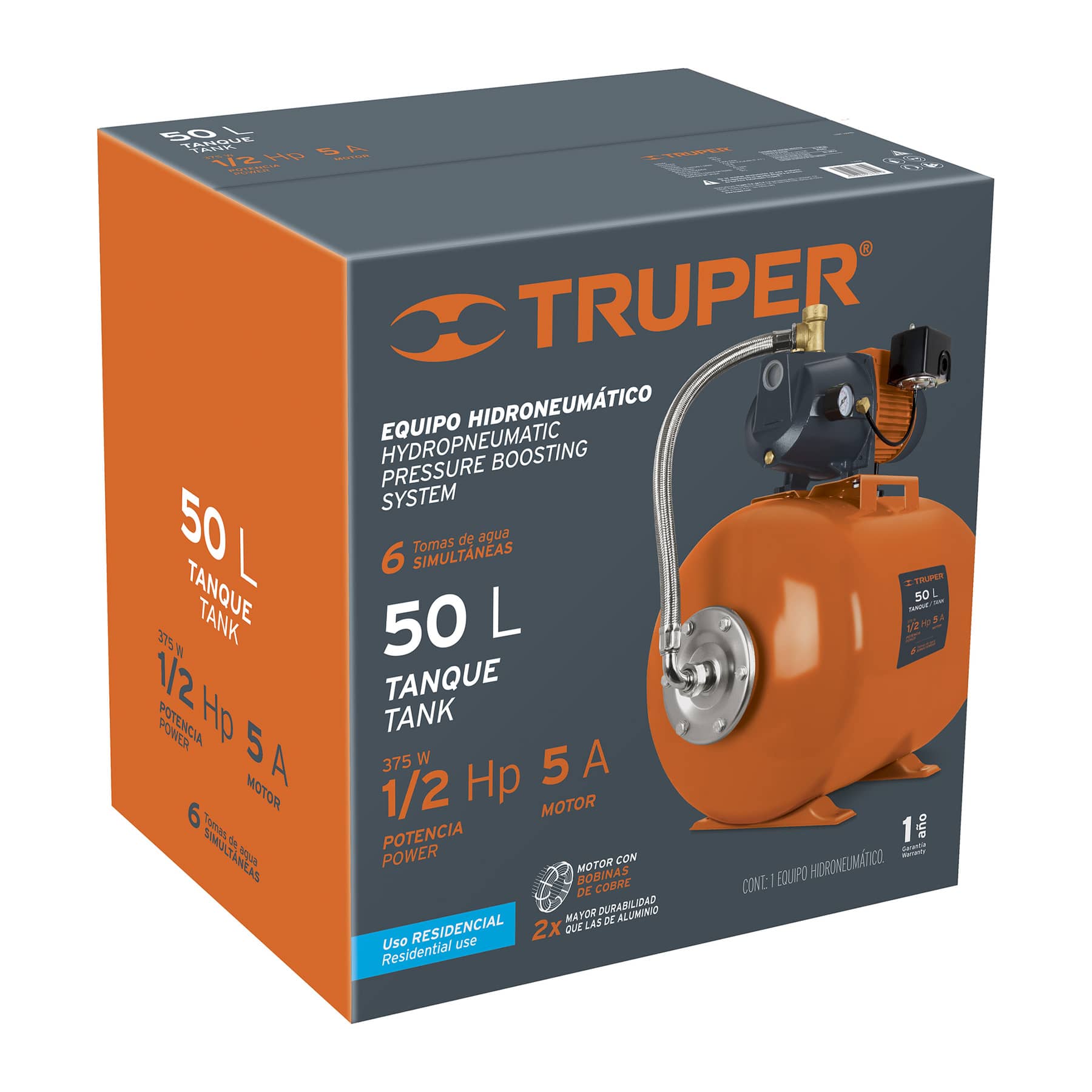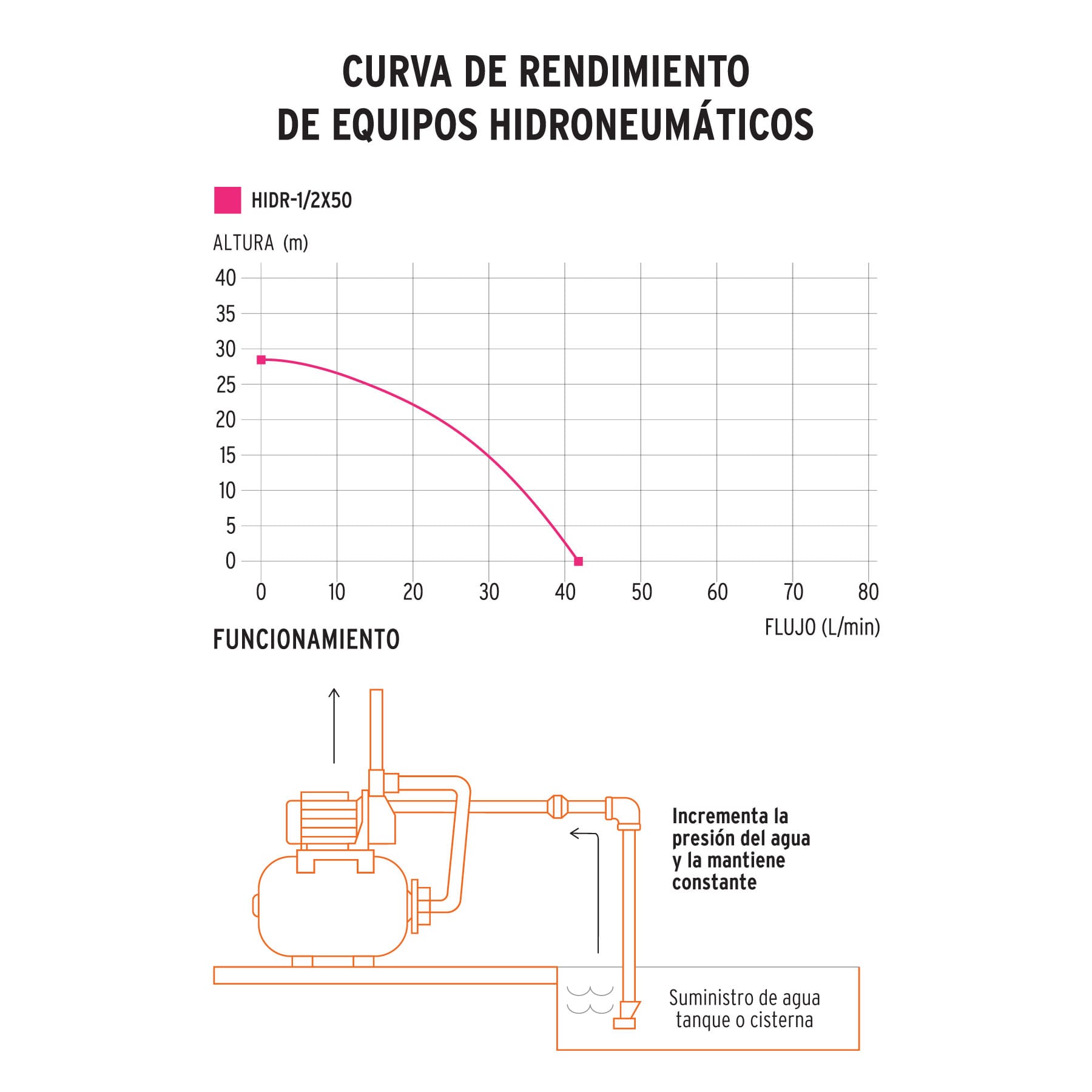 Potencia 1/2 HP (375 W) Tensión 120 V Frecuencia 60 Hz Velocidad 3,400 r/min Diámetro de entrada / salida 1 NPT Flujo máximo 43 L/min Altura máxima 28 m Máxima profundidad 9 m Capacidad del tanque 50 L Temperatura del líquido 40°C Tomas de agua simultáneas 6 Ciclo de trabajo 50 minutos de trabajo por 20 minutos de descanso Máximo diario 6 Horas Dimensiones B 62 x A 64 x D 39 cm Peso 17.6 kg Empaque individual Caja Master 8 Inner 1 Pallet