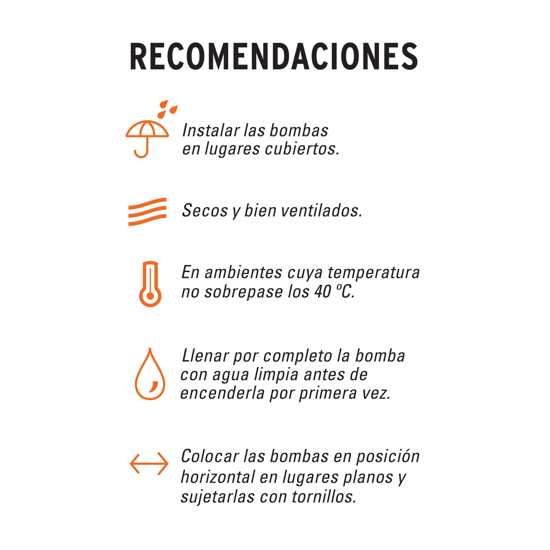 Potencia 1/2 Hp (375 W) Tensión 120 V Frecuencia 60 Hz Velocidad 3,450 r/min Diámetro de entrada / salida 1-11.5 NPT Flujo máximo 40 L/min Altura máxima 20 m Máxima profundidad 8 m Capacidad del tanque 50 L Temperatura del líquido 40°C Tomas de agua simultáneas 6 Ciclo de trabajo 30 minutos de trabajo por 20 minutos de descanso Máximo diario 6 Horas Dimensiones B 63 x A 61 x D 38 cm Peso 13.6 kg Empaque individual Caja Master 8 Inner 1 Pallet