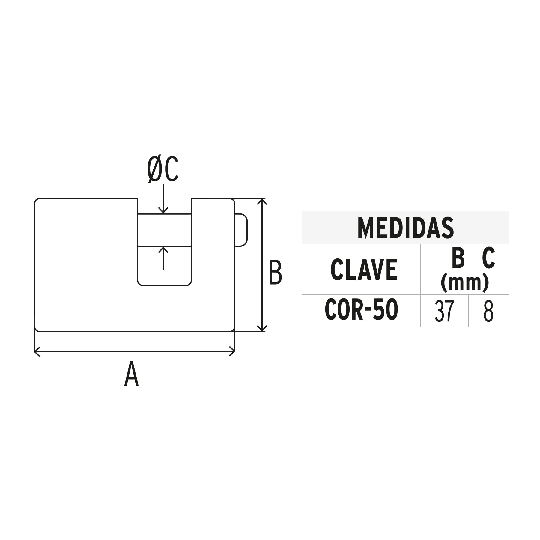 | Código | Clave | Nivel de seguridad | Medida (A) | Alto | Diámetro del pasador | Inner | Master | Pallet |