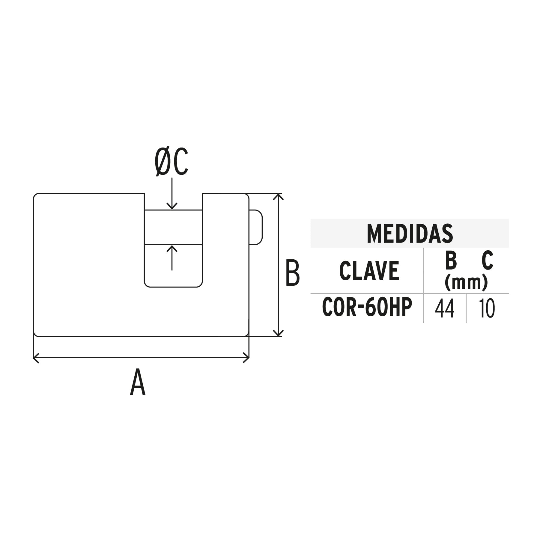 | Código | Clave | Nivel de seguridad | Medida (A) | Alto | Diámetro del pasador | Inner | Master | Pallet |