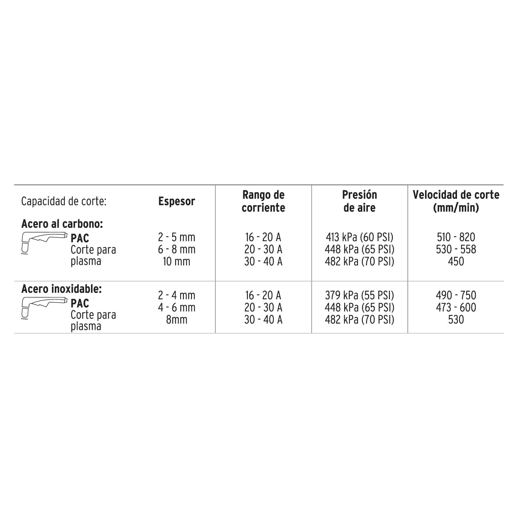 | Alimentación | 1 FASE (127 V CD / 22 A / 60 Hz) 2 FASES (220 V CD / 30 A / 60 Hz) |