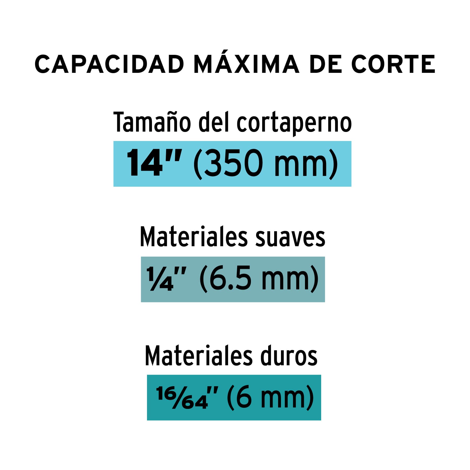 12831 | CP-14X | 14" (36 cm) | Materiales suaves 1/4" (6.3 mm), materiales duros 15/64" (6.0 mm) | 1" (25.4 mm) | 16 | 384 |