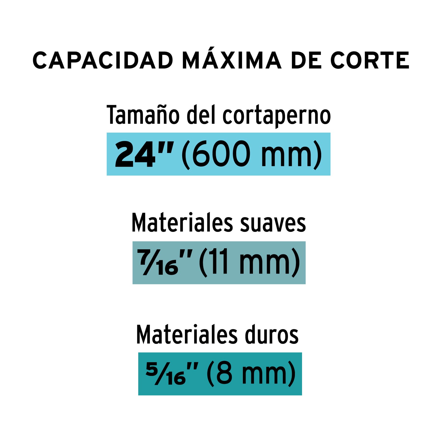 12833 | CP-24X | 24" (61 cm) | Materiales suaves 7/16" (11 mm), materiales duros 5/16" (7.9 mm) | 1 1/4" (32 mm) | 6 | 192 |