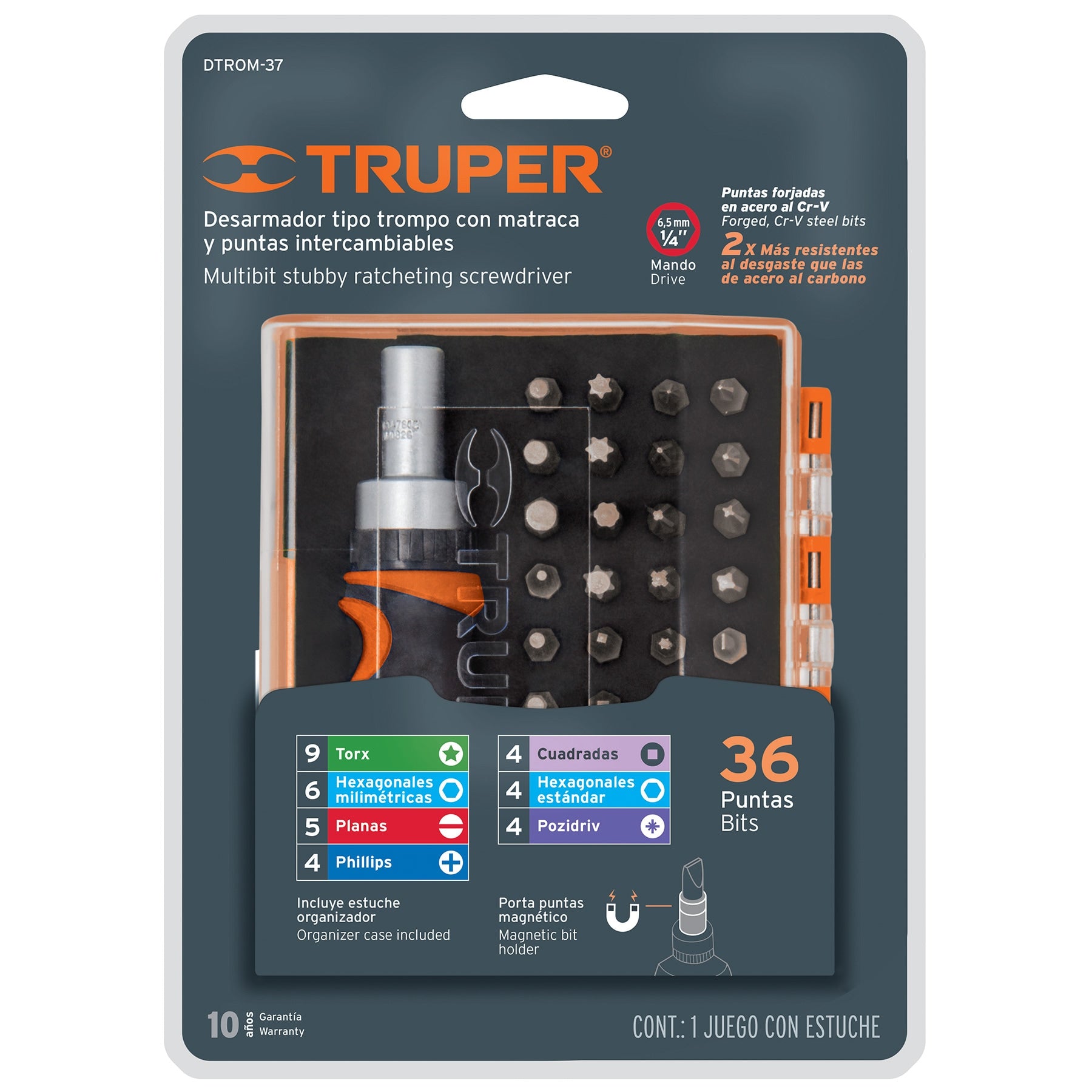 Desarmador tipo trompo con matraca, 37 piezas