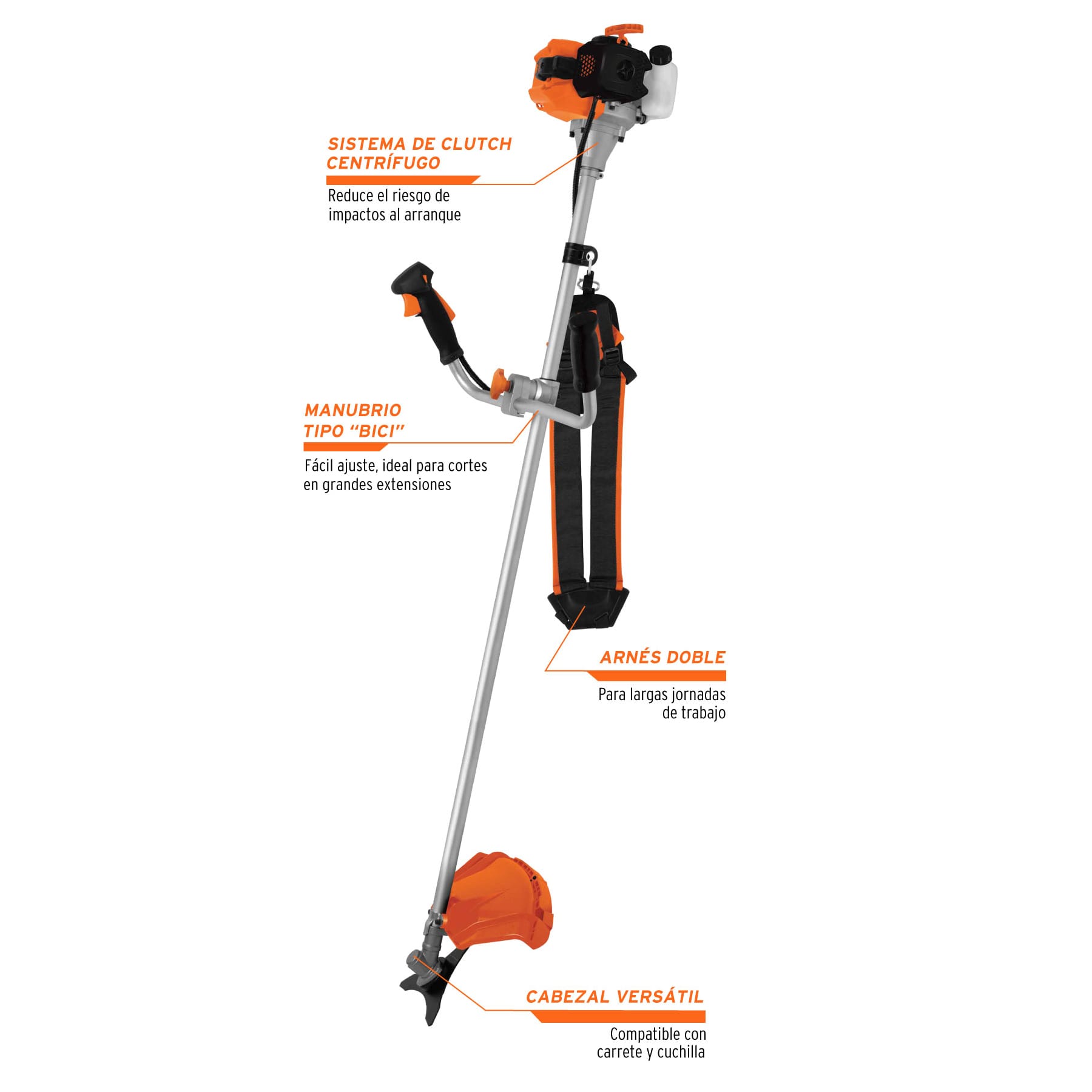- Sistema de arranque con embrague y sistema de clutch centrífugo reduce el riesgo de impacto al arranque