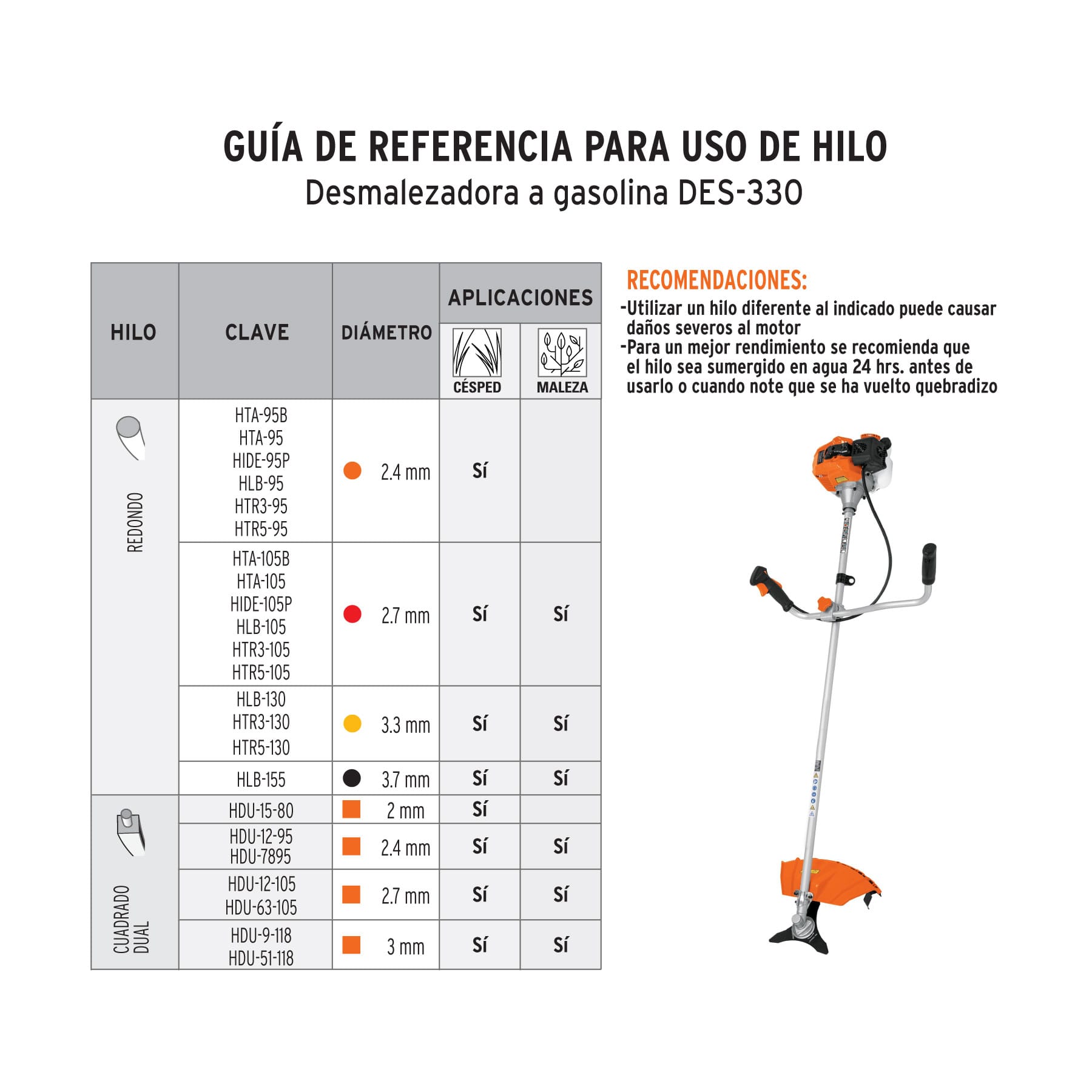 | Diámetro de hilo recomendado | 2.4 - 3.7 mm |