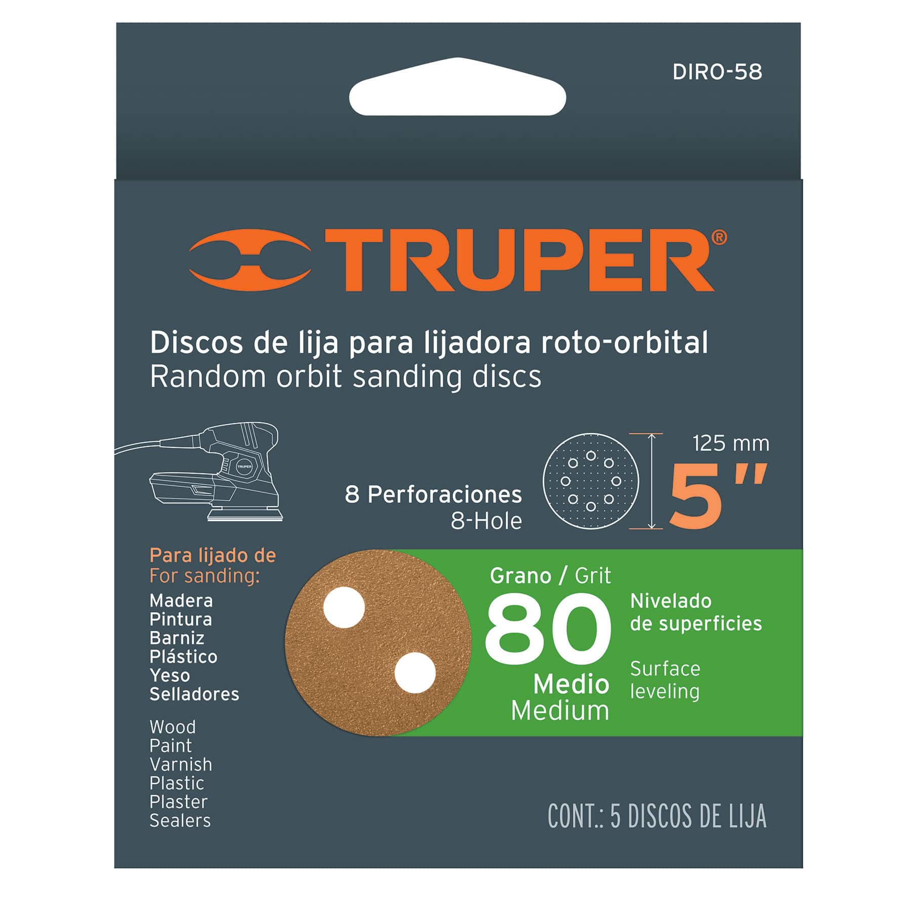 Discos de lija roto orbital 5", grano 80, 8 orificios, 5pzas
