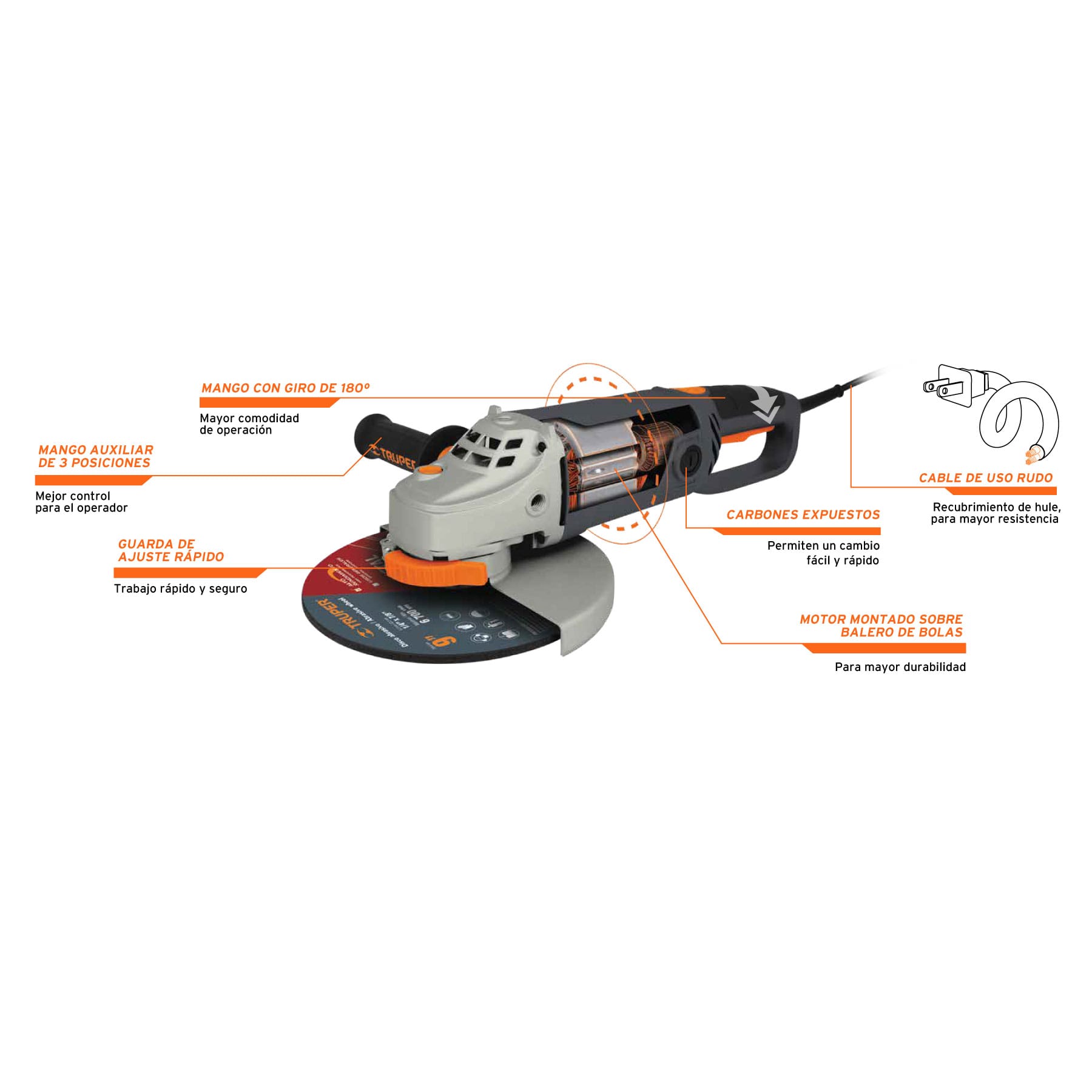 - Uso industrial, para esmerilar y cortar acero, tubos, hierro en ángulo, ladrillos, azulejos, piedra y/o piezas de cerámica