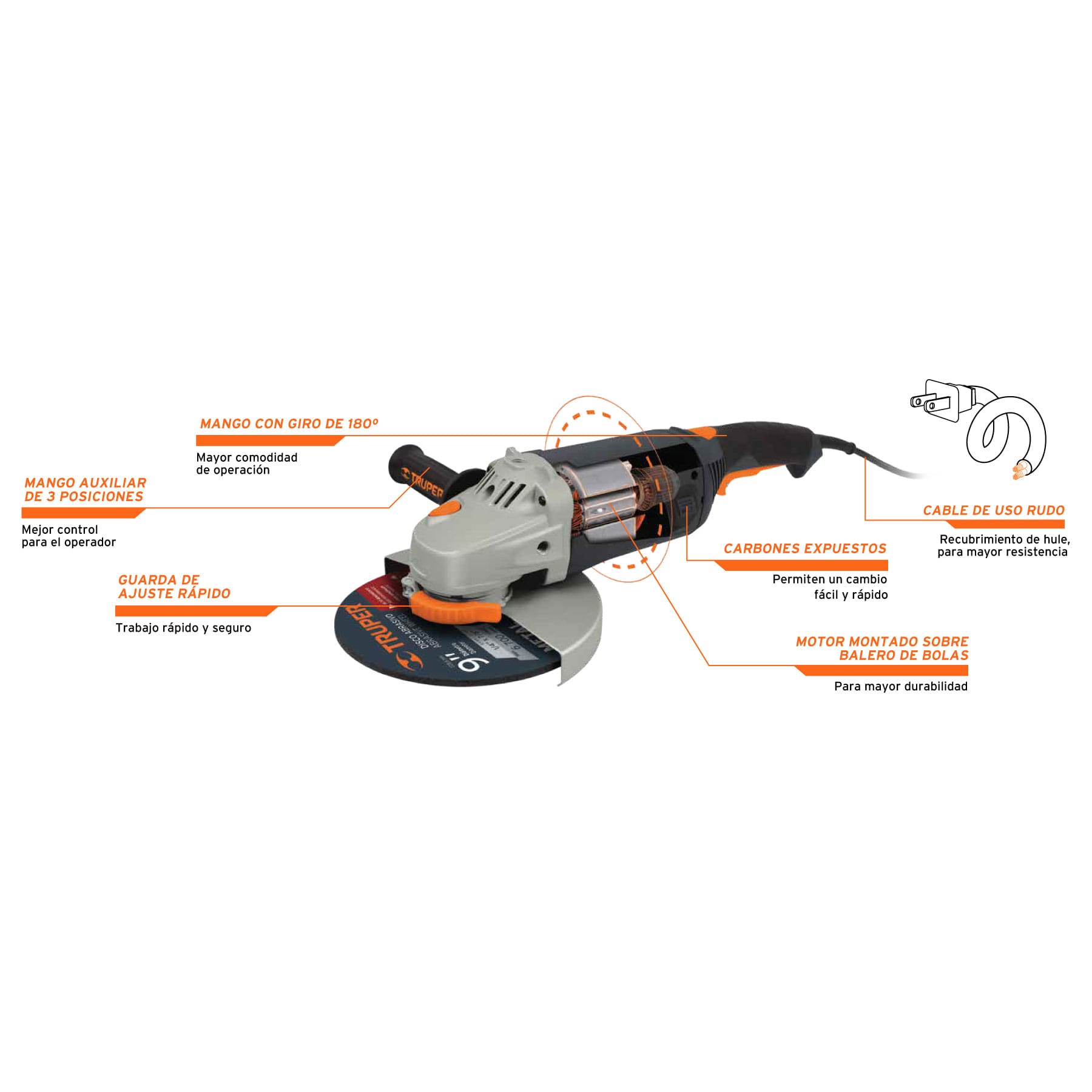 - Motor de 2,350 W, montado sobre balero de bolas para mayor vida útil y mejor desempeño