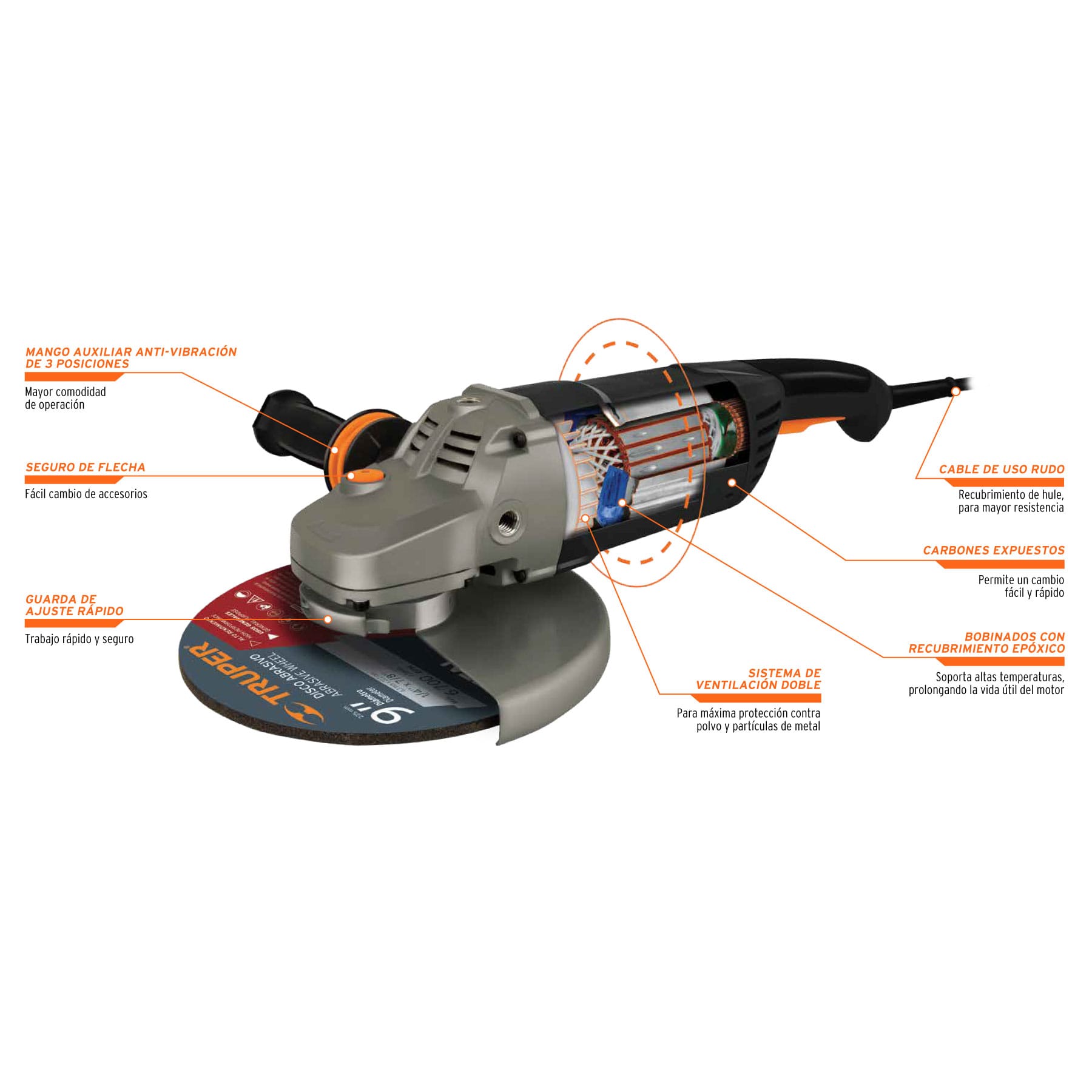 - Ventilación doble con máxima protección contra polvo y partículas metálicas que prolonga la vida del motor