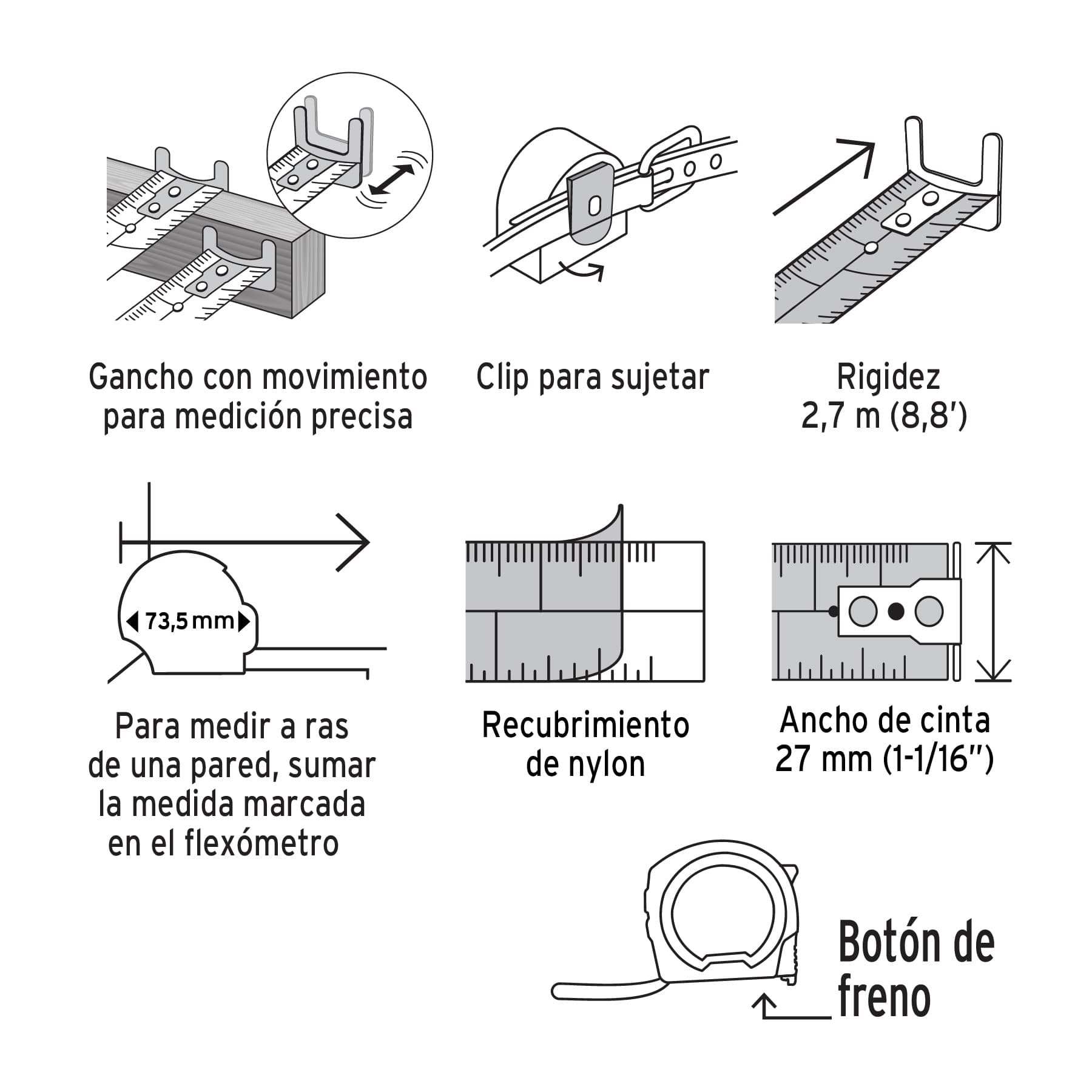 - Cintas extra anchas que permiten mayor extensión, impresas por ambos lados, fabricadas en acero negro resistente a la corrosión
