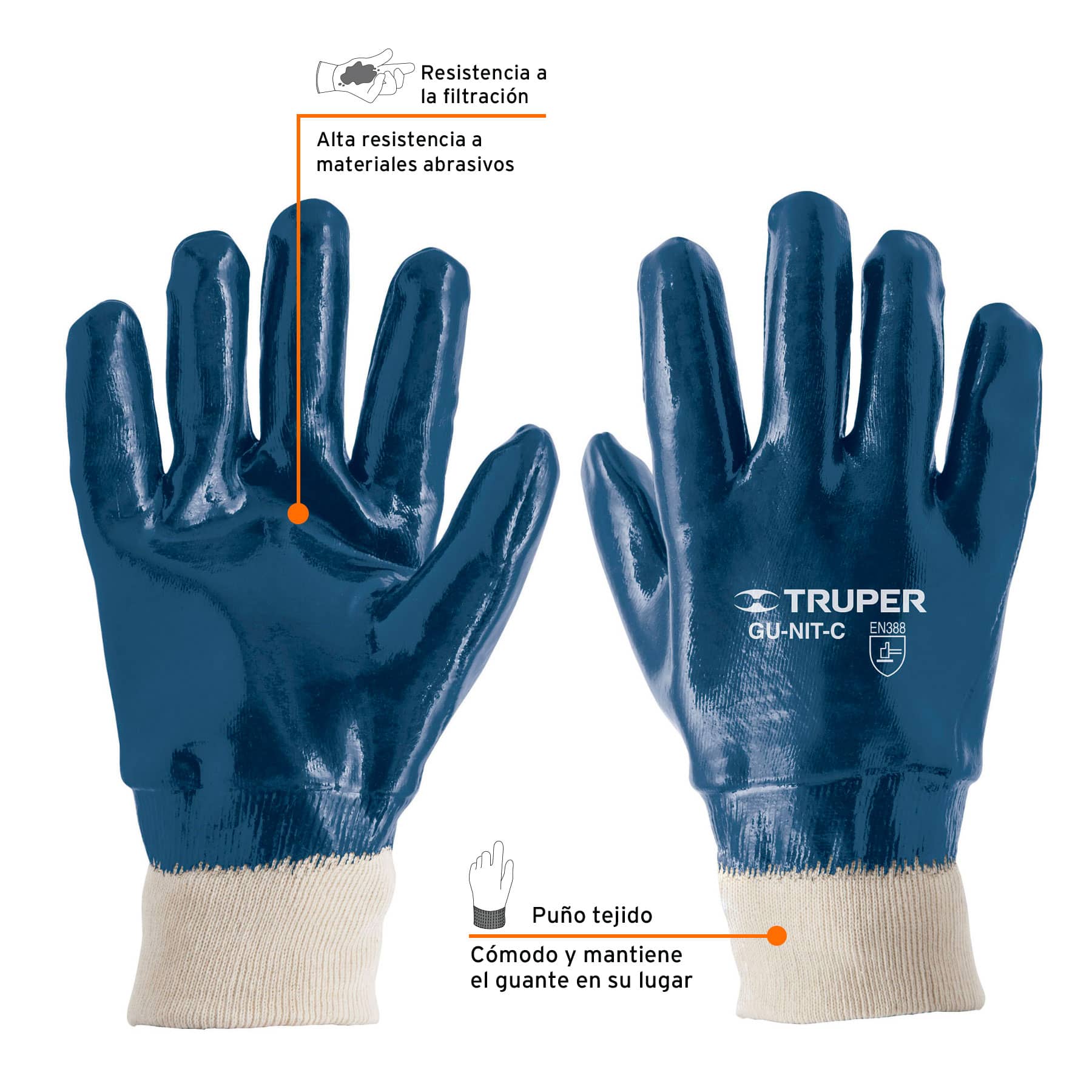 - Fabricados de algodón con recubrimiento de nitrilo extra pesado, soporte interno de algodón, lo cual permite protección excepcional en trabajos con materiales ásperos y abrasivos