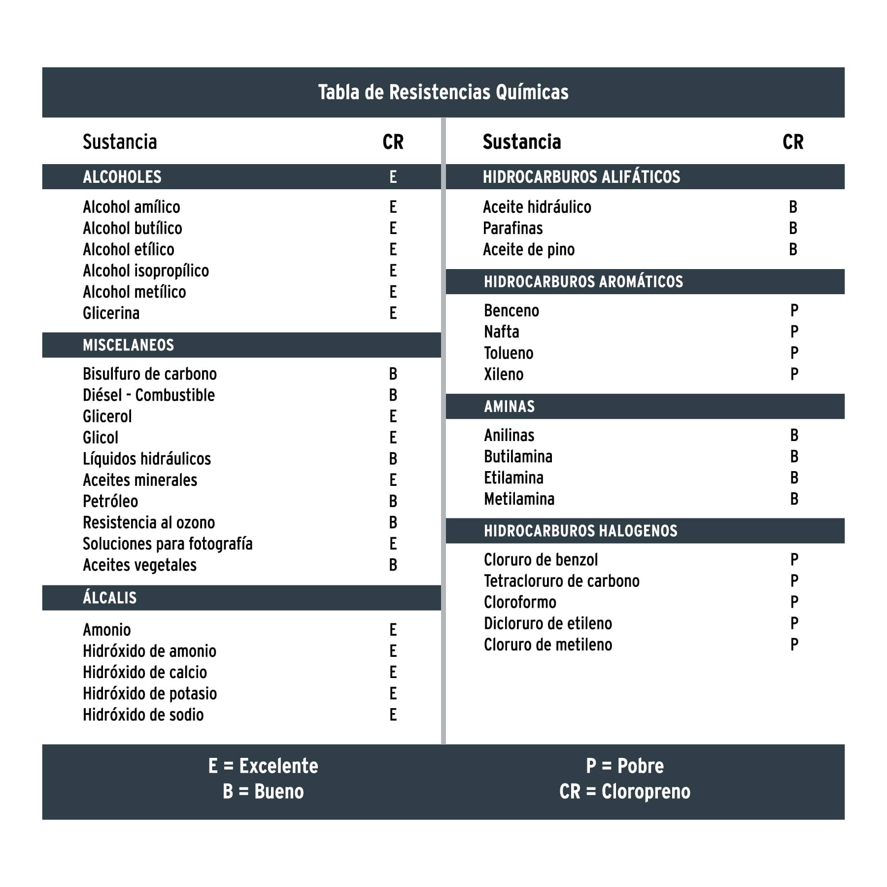 - Resistencia a solventes, aceites, grasas, ácidos, alcalinos y productos químicos