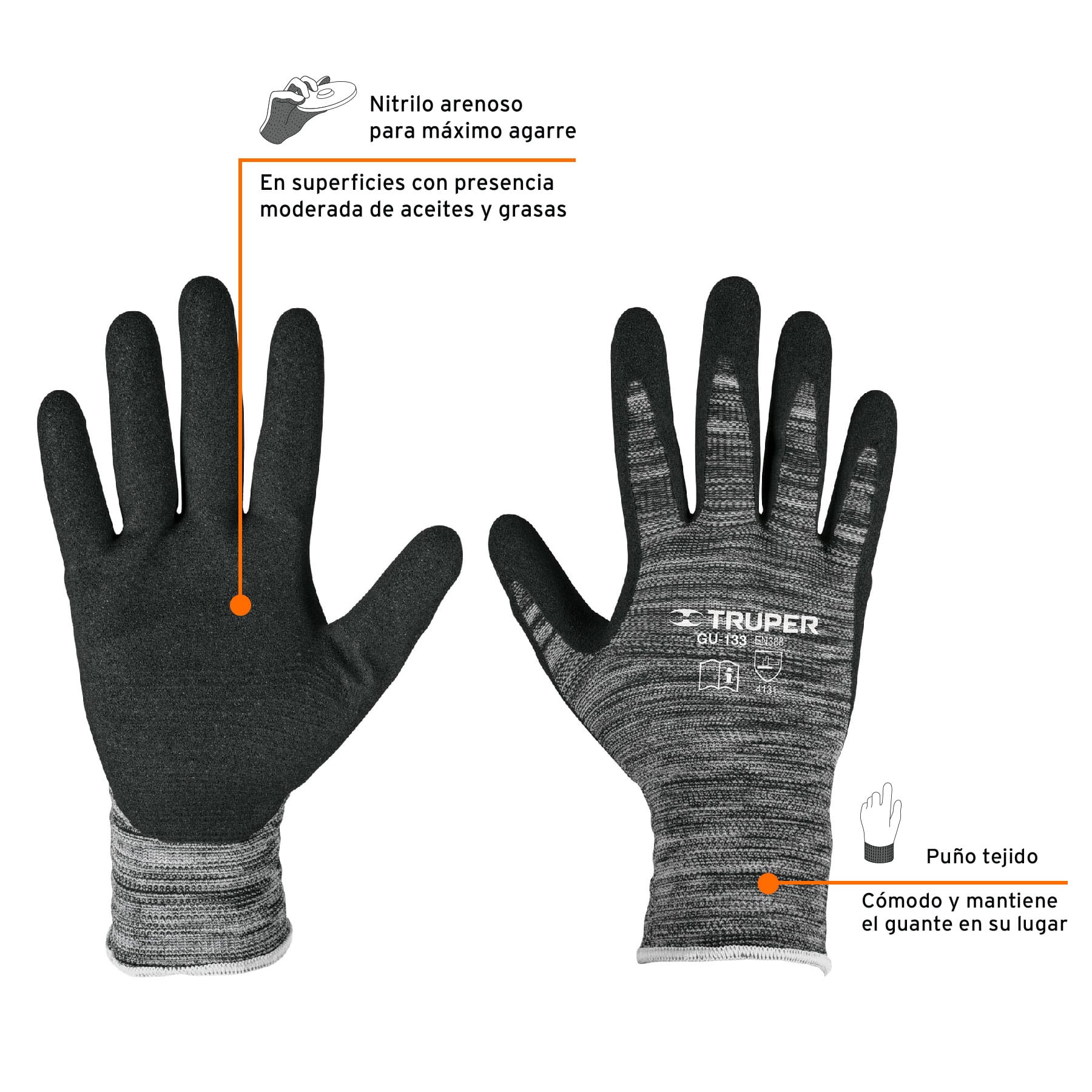 - Fabricados de nylon con recubrimiento de nitrilo arenoso en palmas para máximo agarre