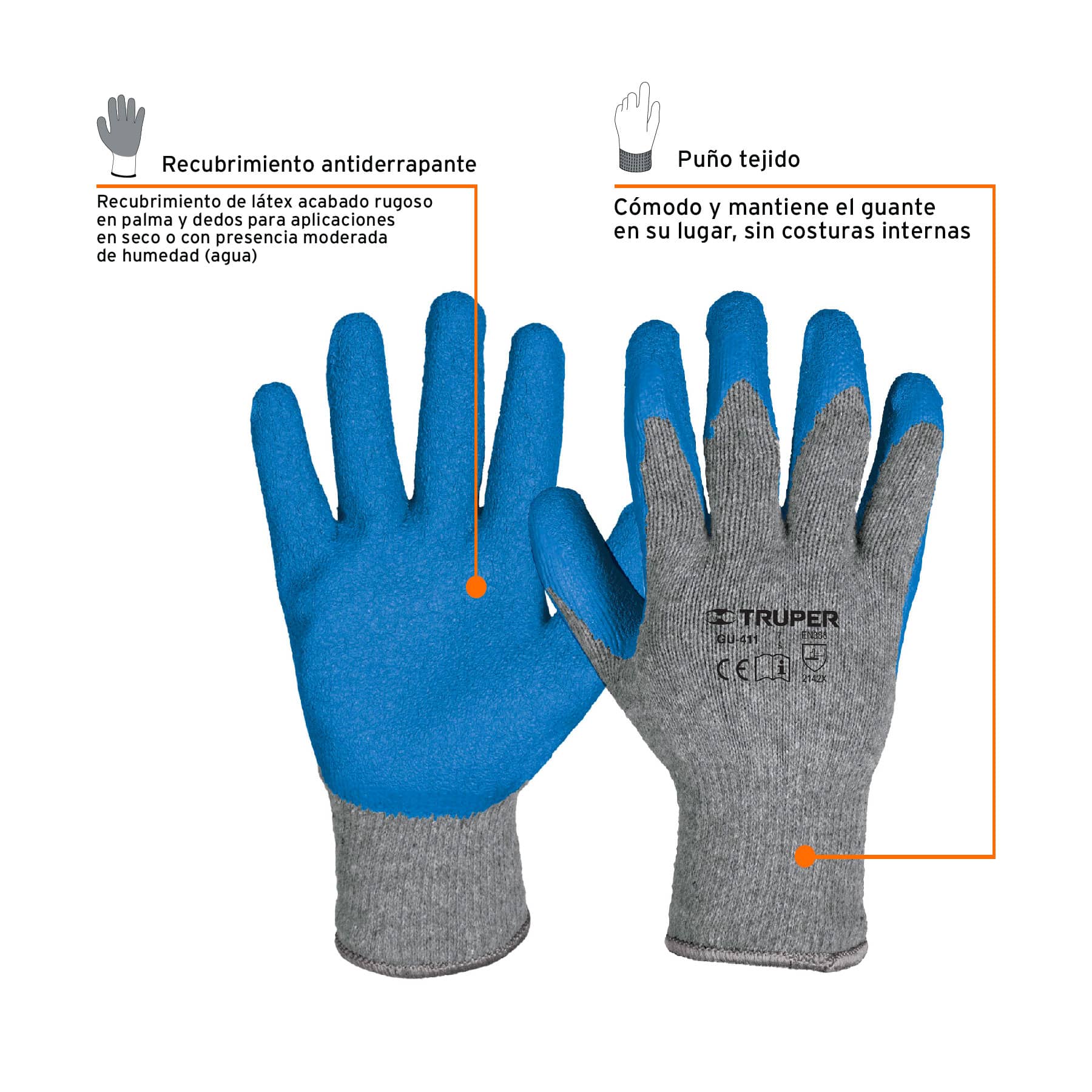 - Látex rugoso en palmas y dedos con excelente agarre en superficies secas o ligeramente húmedas (no solventes)