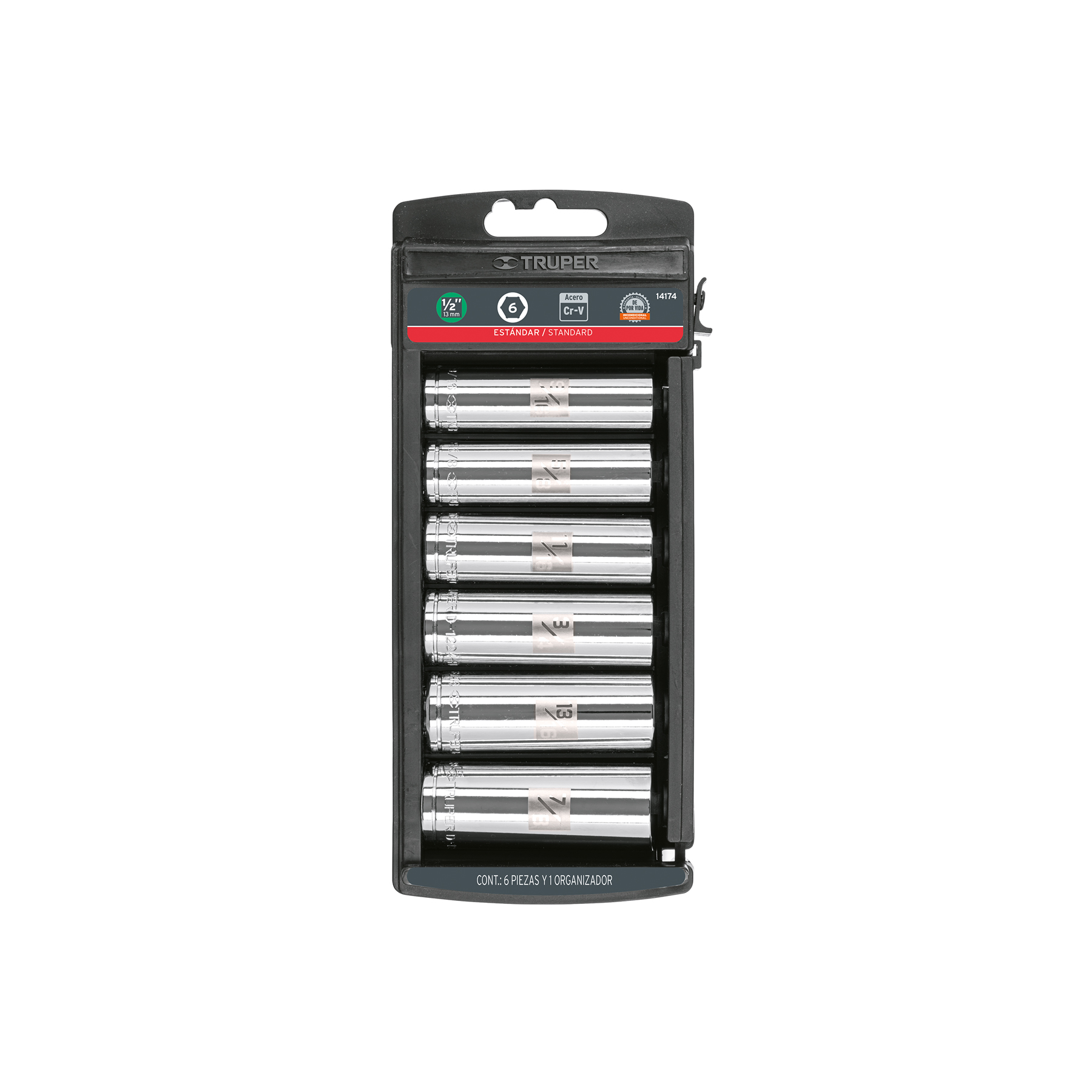 - Código 14174: 1 Dado largo de 6 puntas de 9/16", 1 Dado largo de 6 puntas de 5/8", 1 Dado largo de 6 puntas de 11/16", 1 Dado largo de 6 puntas de 3/4", 1 Dado largo hexagonal de 13/16", 1 Dado largo de 6 puntas de 7/8"