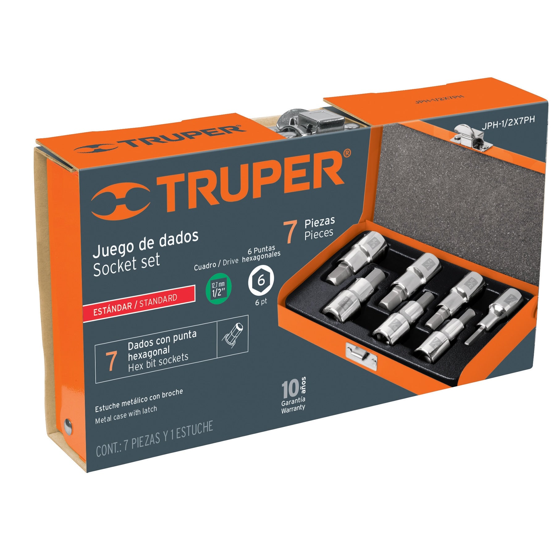 Juego dados punta hexagonal, cuadro 1/2", 7 piezas