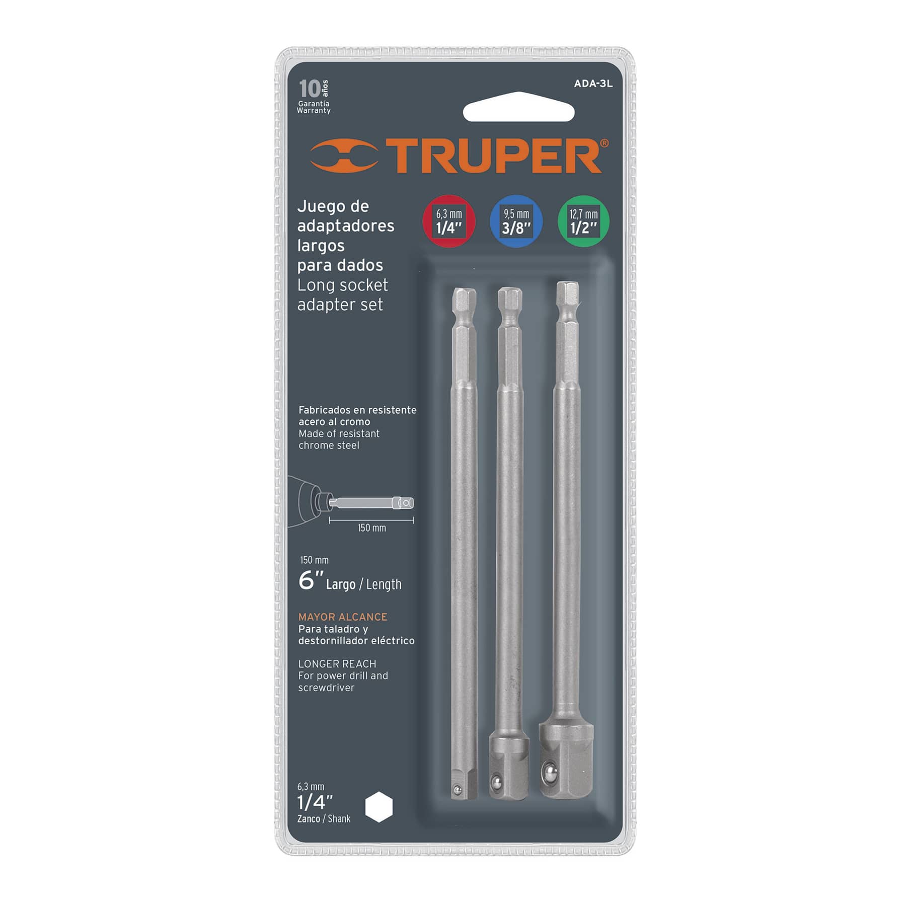 Juego de adaptadores largos para dados, 1/4, 3/8 y 1/2", 3pzas