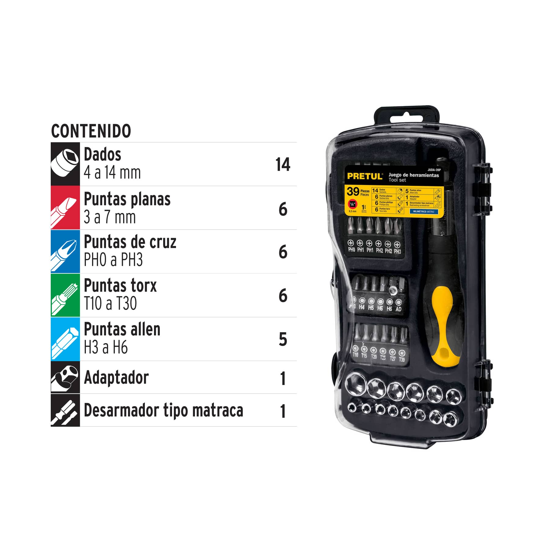 Juego de matraca, dados y puntas para mecánico, 39 piezas, Pretul