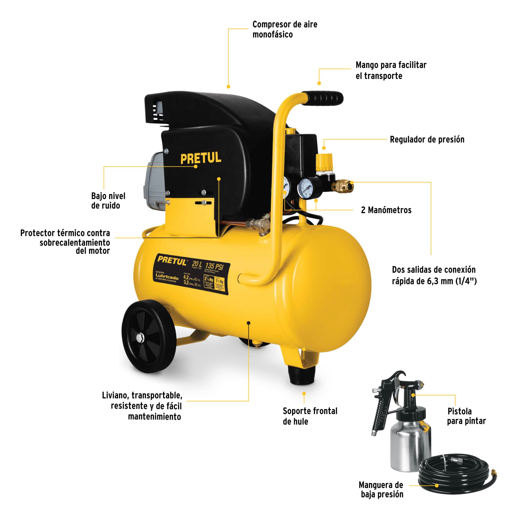 Kit, compresor 20 L , 2-1/2 HP, manguera PVC y pistola , Pretul