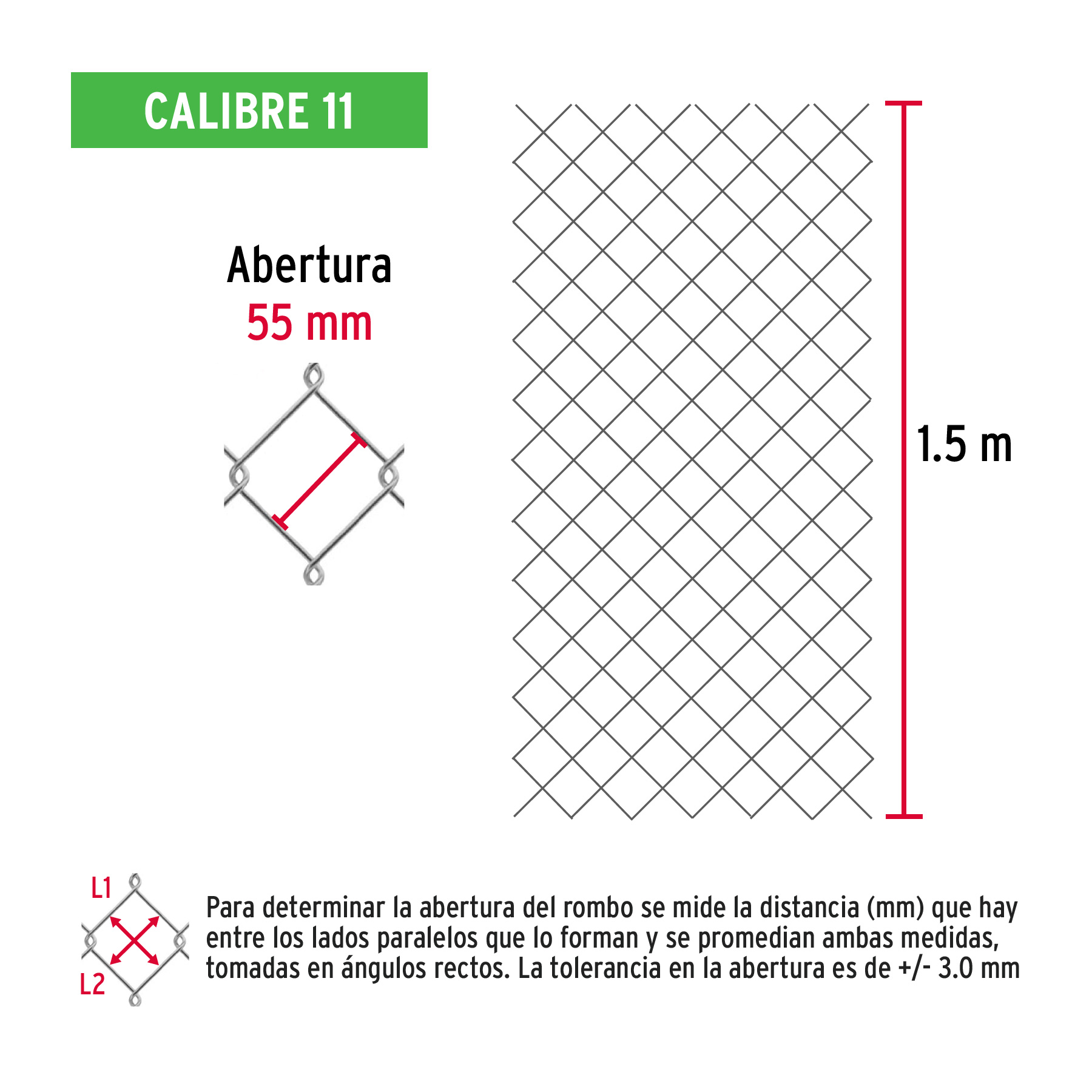 Malla ciclónica, calibre 11, abertura 55 x 55, 1.50 x 20 m