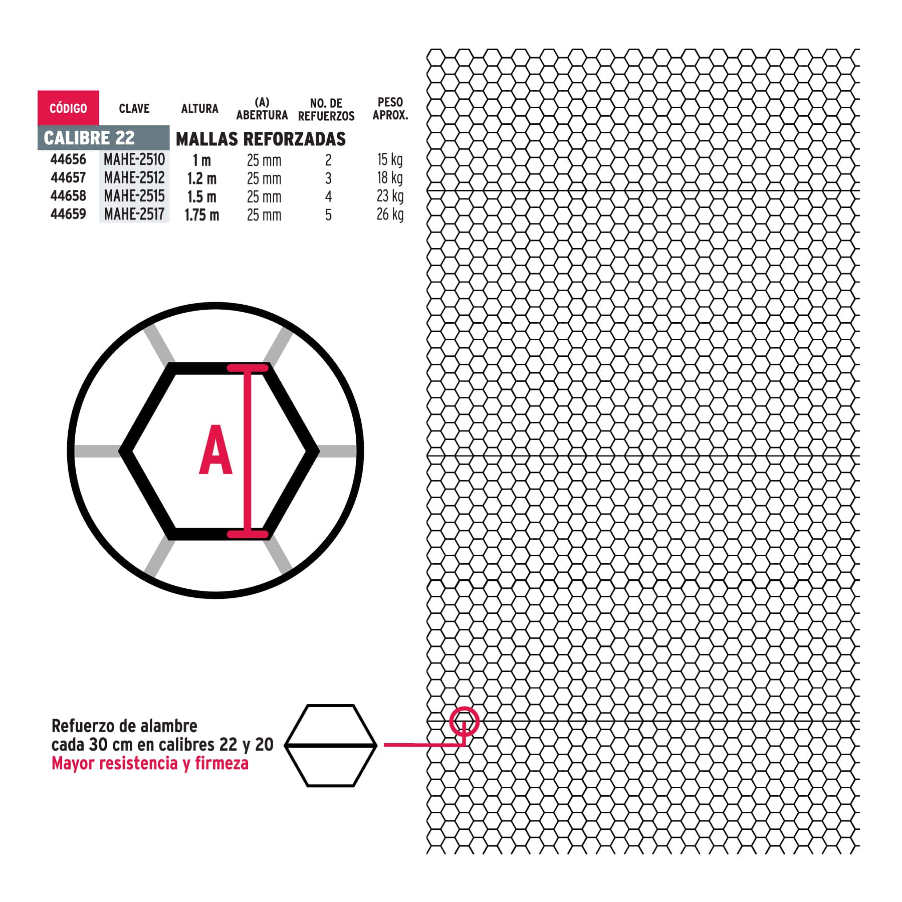 - Refuerzo de alambre cada 30 cm en calibres 22 y 20 para mayor resistencia y firmeza