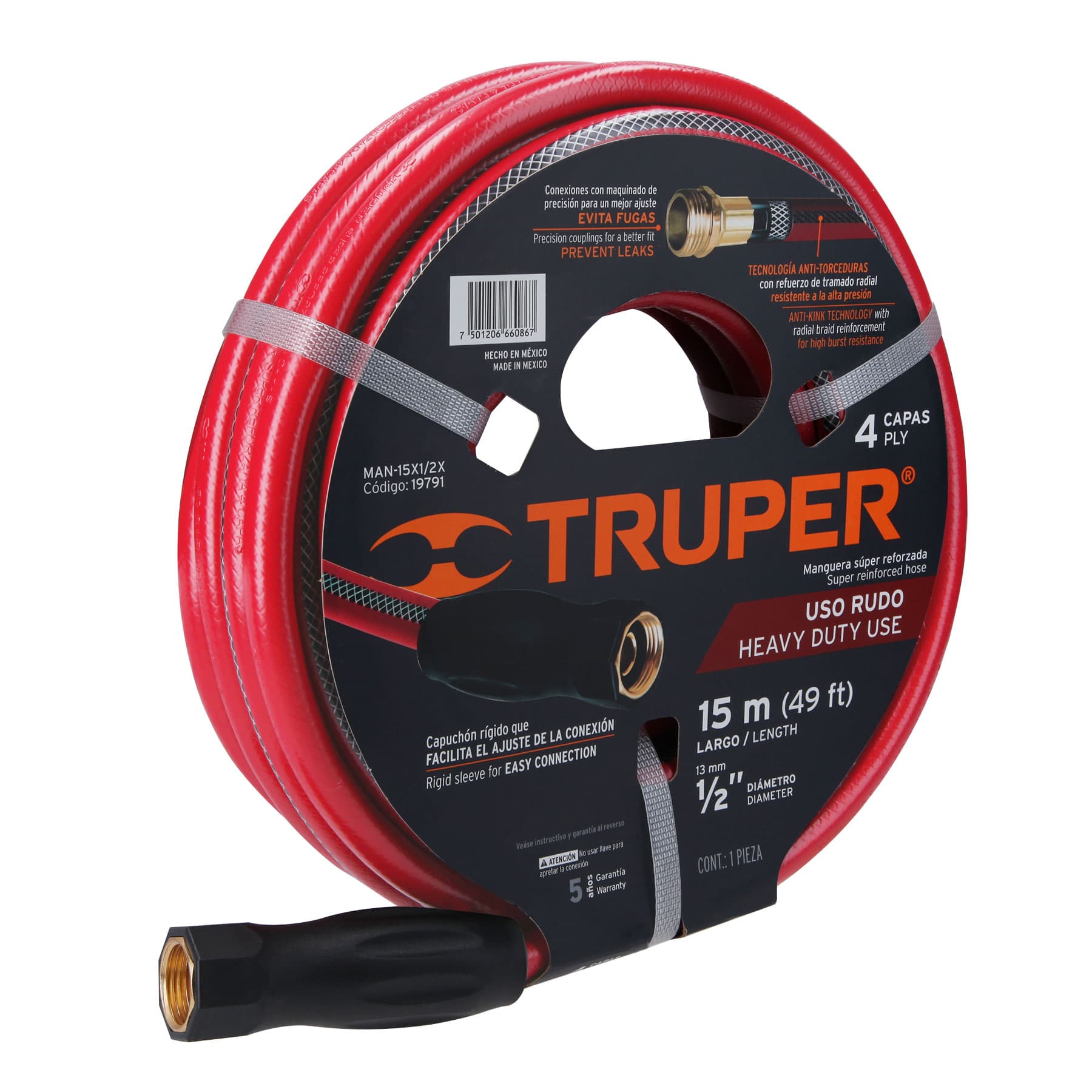 Manguera 1/2", super reforzada 4 capas, conexiones metal, 15m
