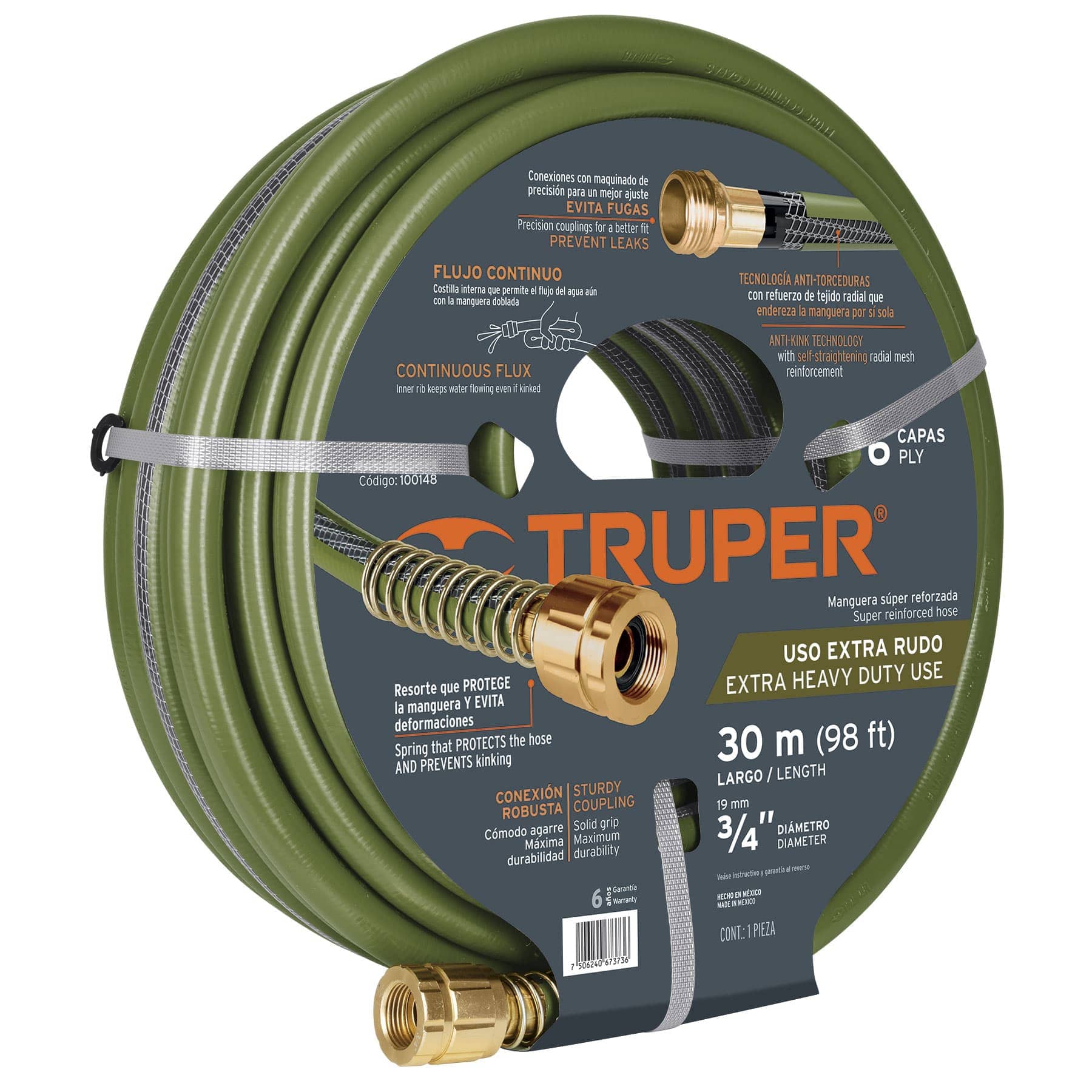 Manguera 3/4", flujo continuo 6 capas, conexiones metal, 30m