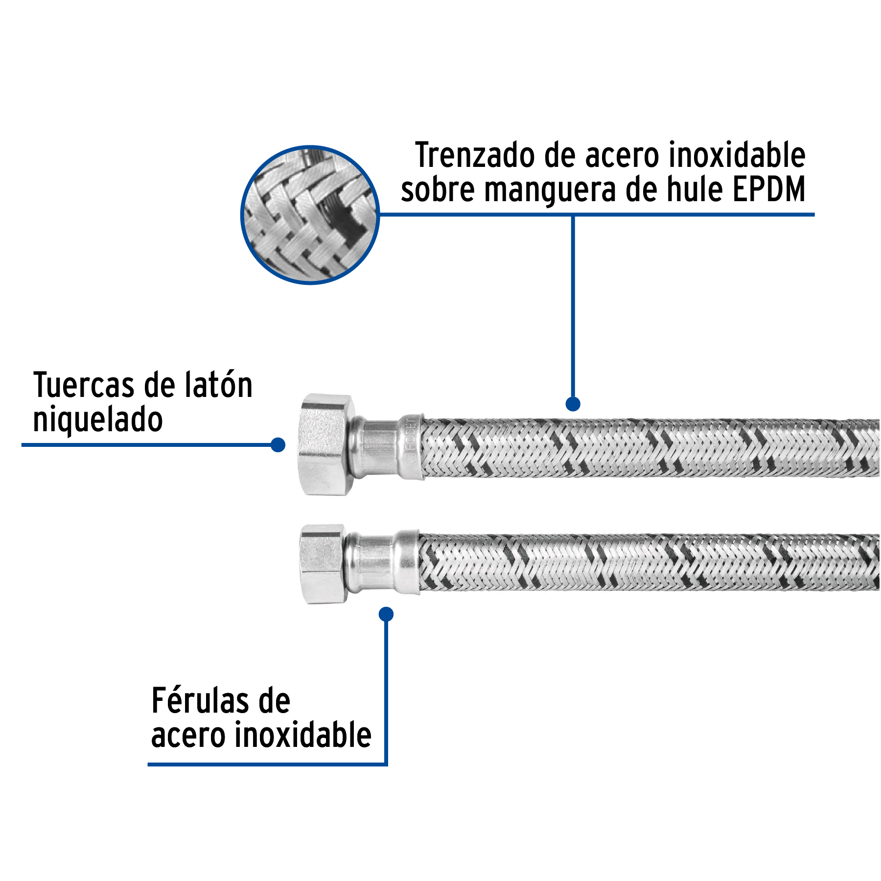 - Trenzados de acero inoxidable sobre mangueras de hule EDPM para mayor durabilidad y resistencia a la presión