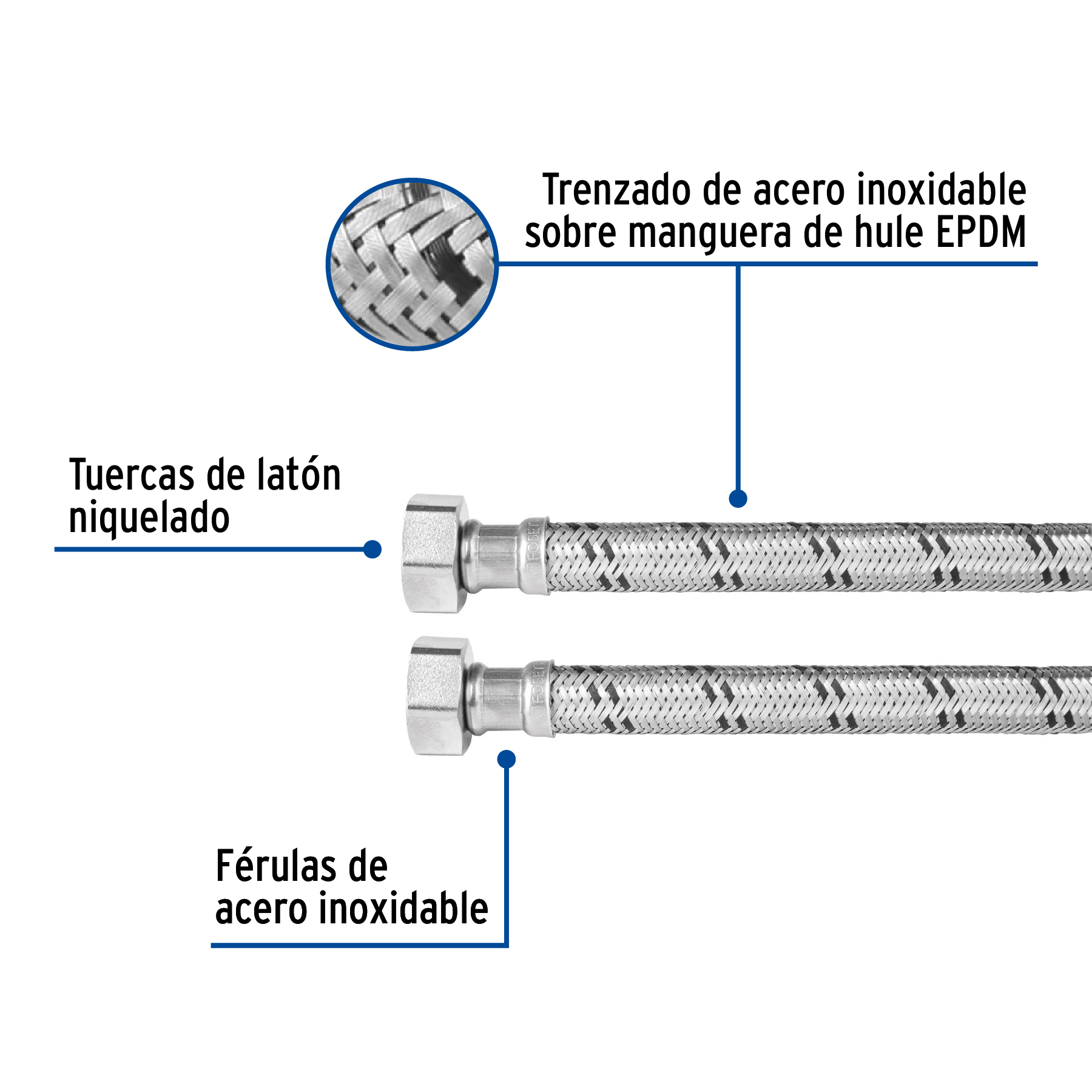 - Trenzados de acero inoxidable sobre mangueras de hule EDPM para mayor durabilidad y resistencia a la presión