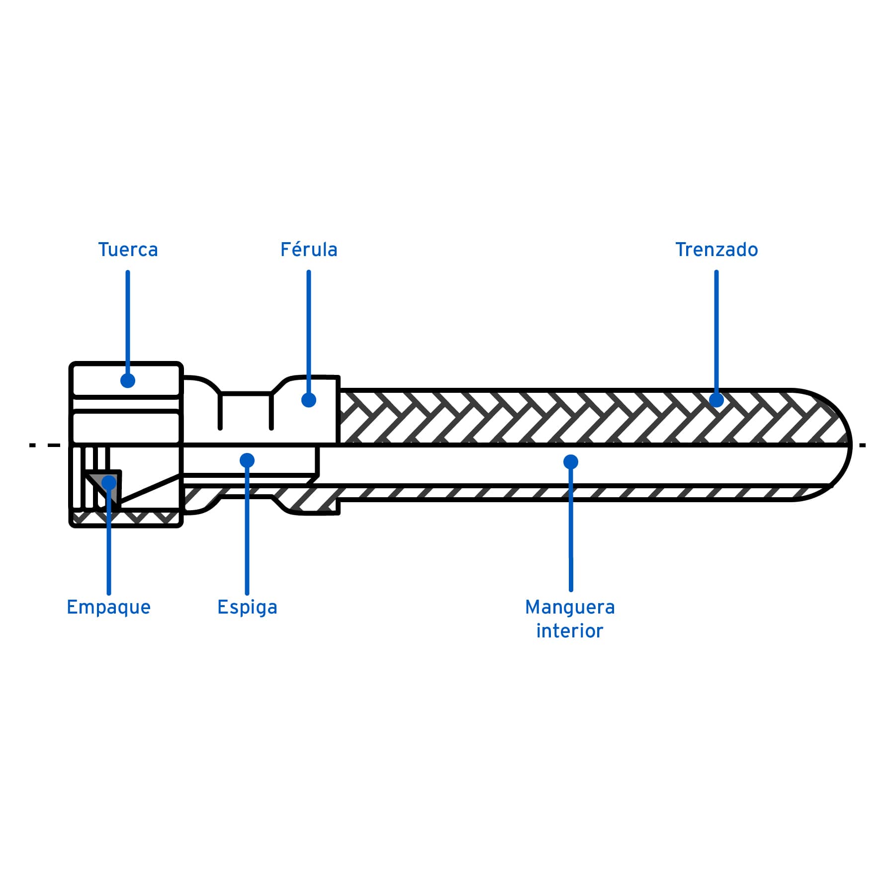 - Trenzado de acero inoxidable sobre manguera de hule EDPM para mayor durabilidad y resistencia a la presión
