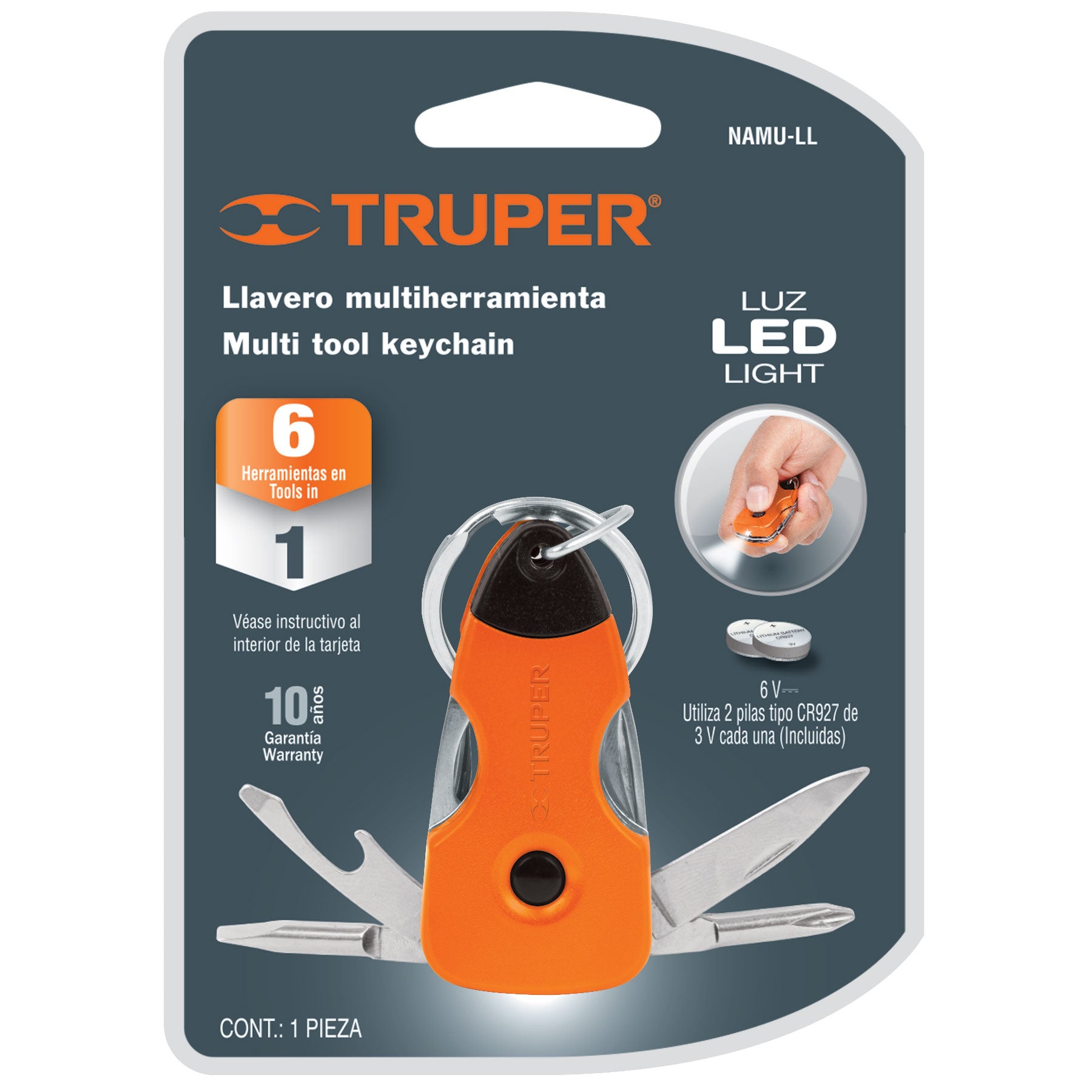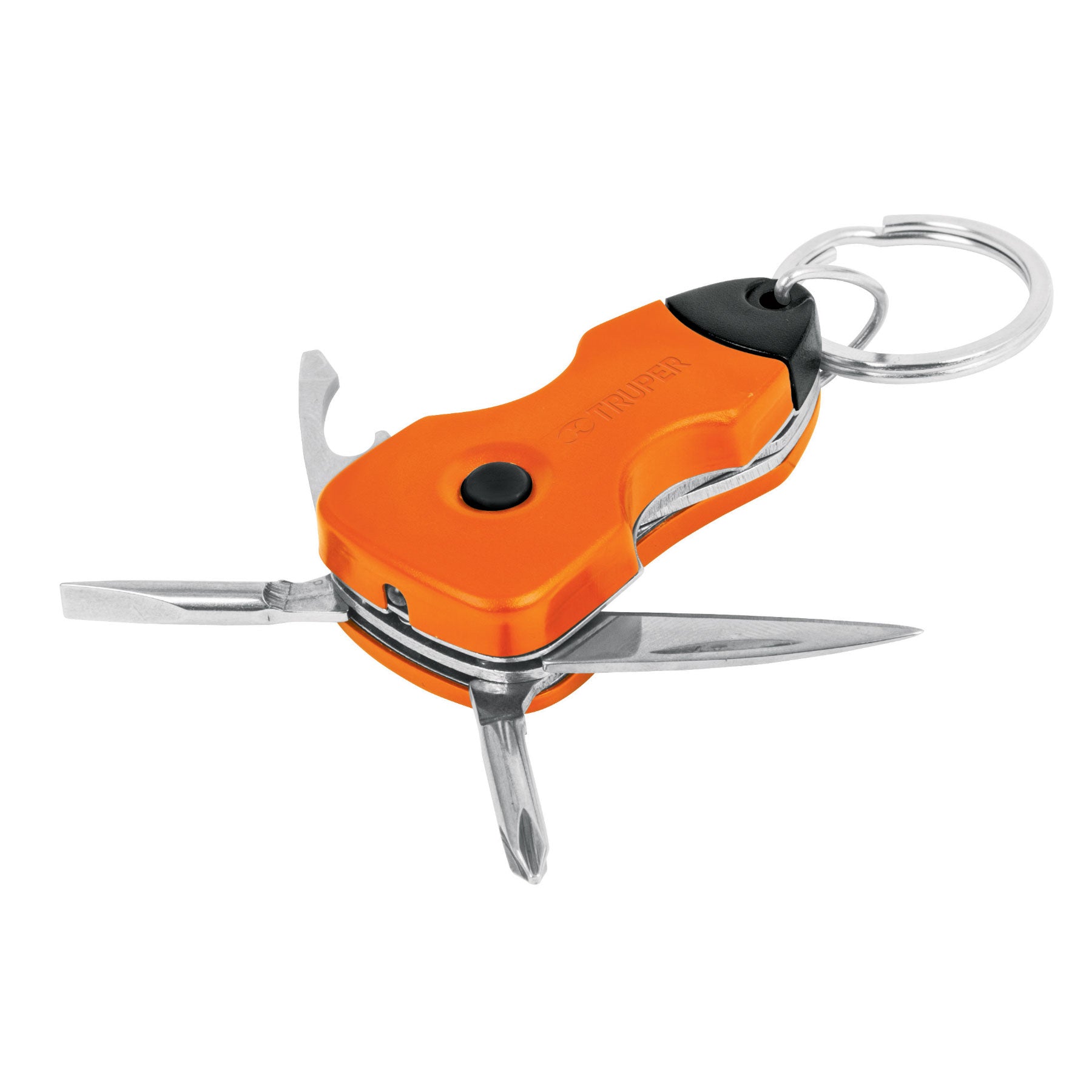 - 6 Funciones, desarmador plano, desarmador plano pequeño, destapador, botón para encendido de luz LED, navaja, desarmador phillips
