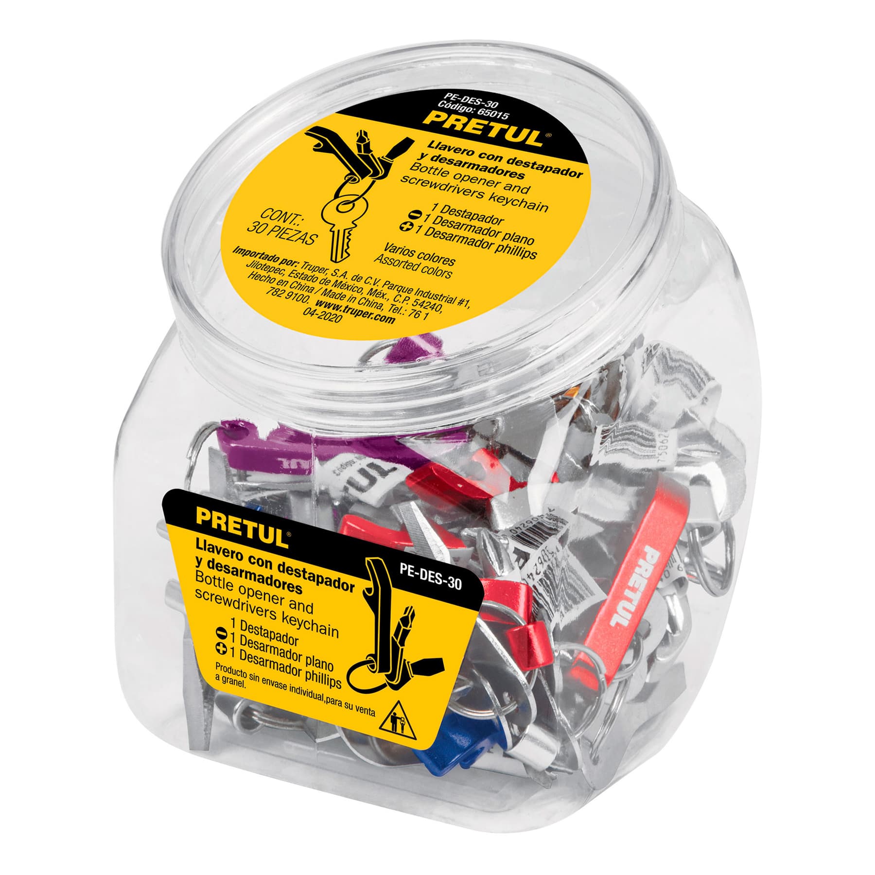 Pecera con llaveros desarmador y destapador, 30 pzas.
