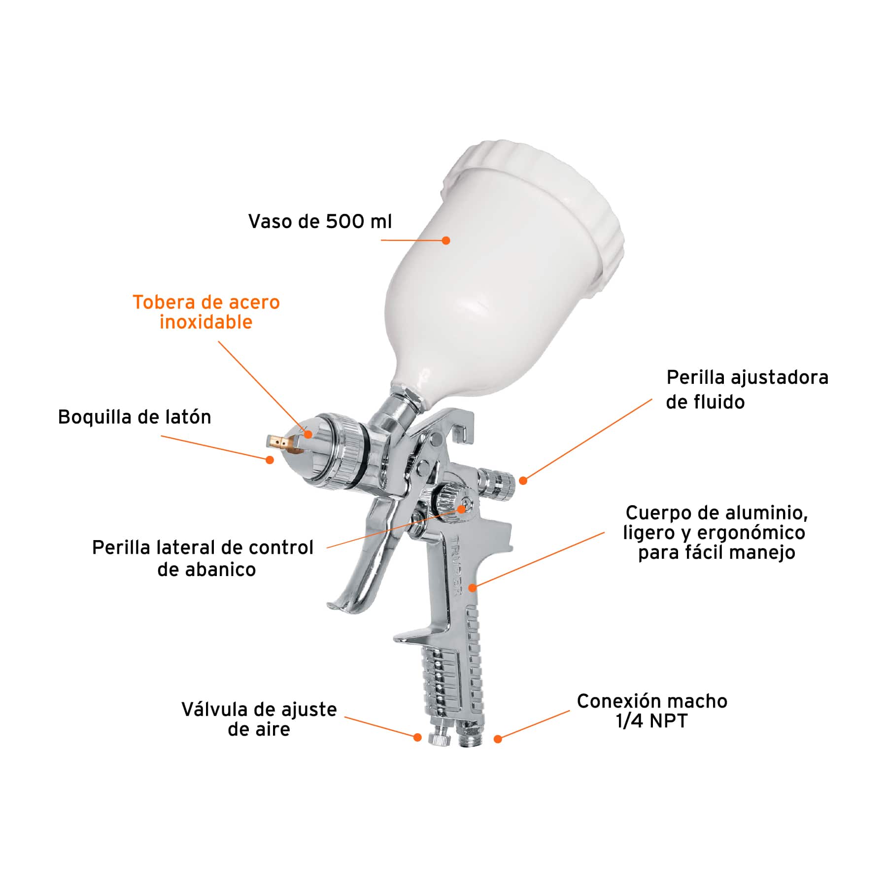 - Tecnología de pulverización HVLP (Alto Volumen-Baja presión), ideal para acabados finos, con máximo rendimiento de pintura y mayor control de aplicación