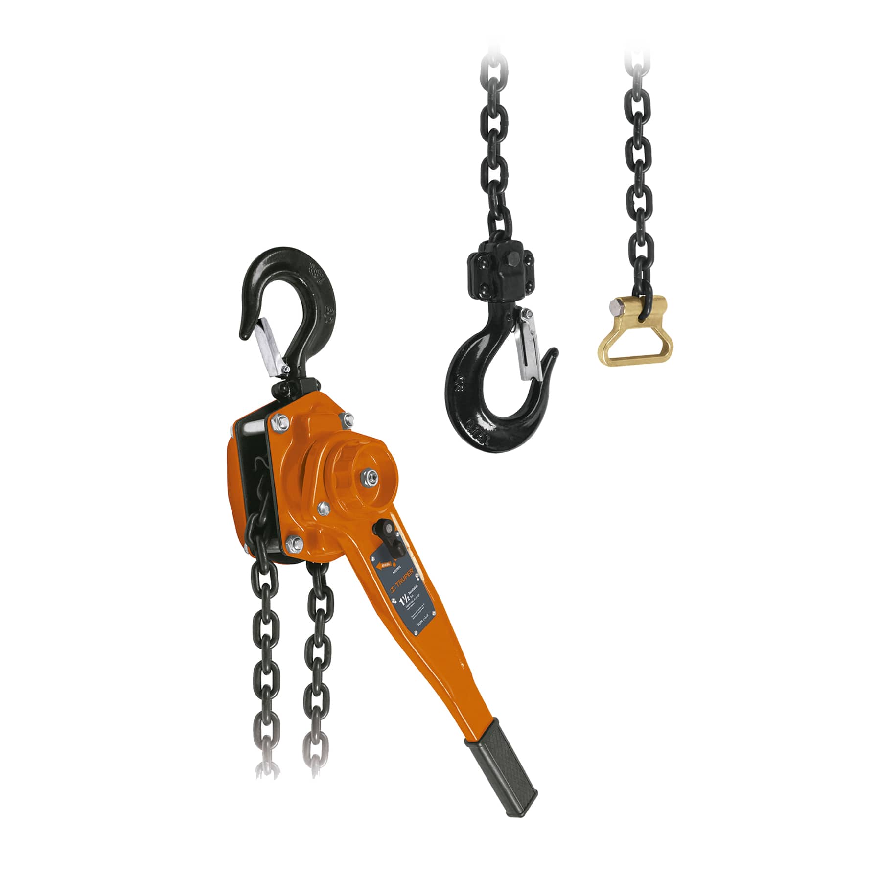 - Ganchos forjados en acero al cromo con giro de 360° y pestaña de seguridad