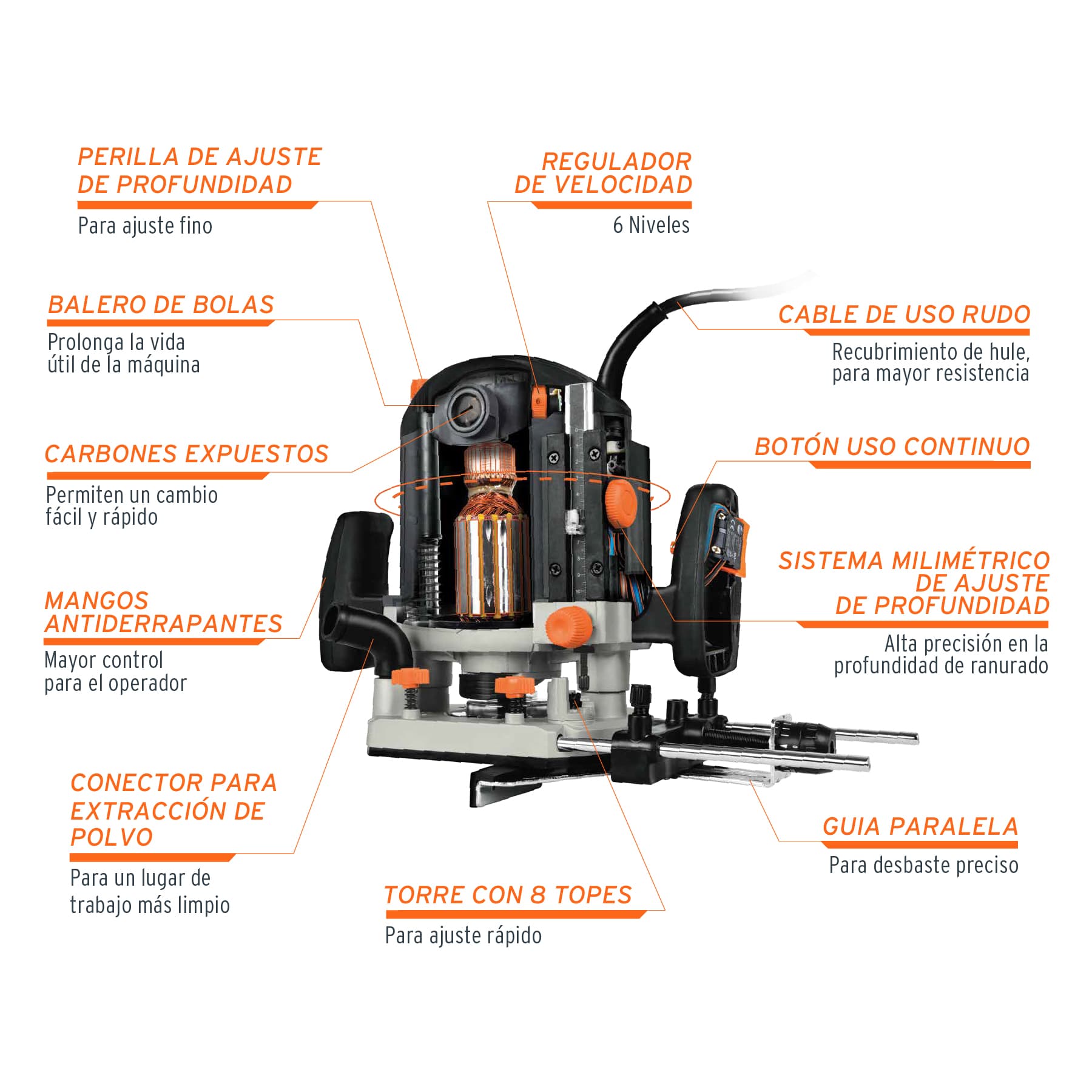 - Motor de 1800 W, montado sobre balero de bolas para mayor vida útil y mejor desempeño