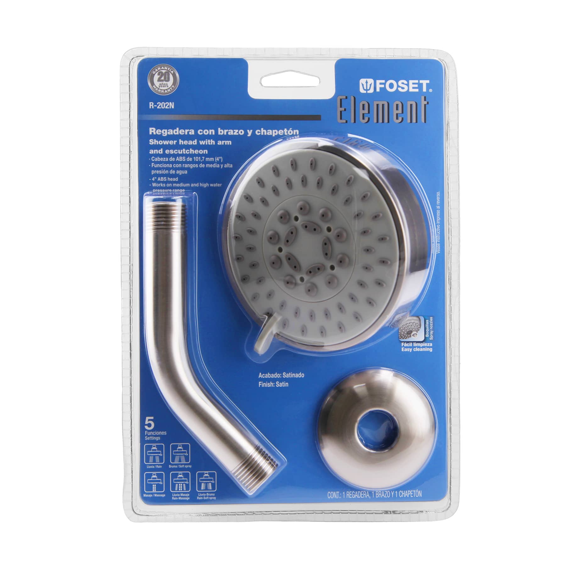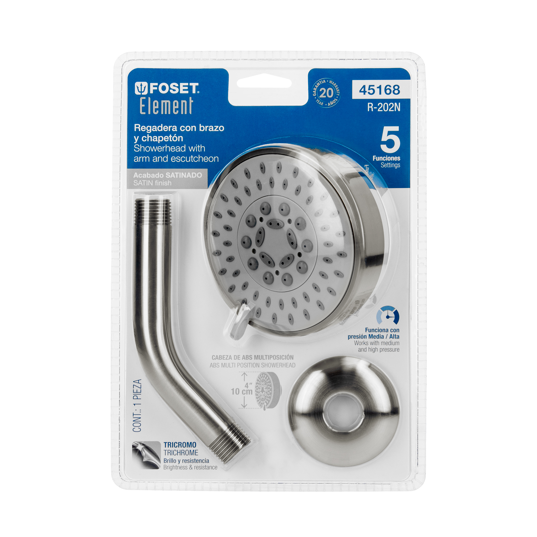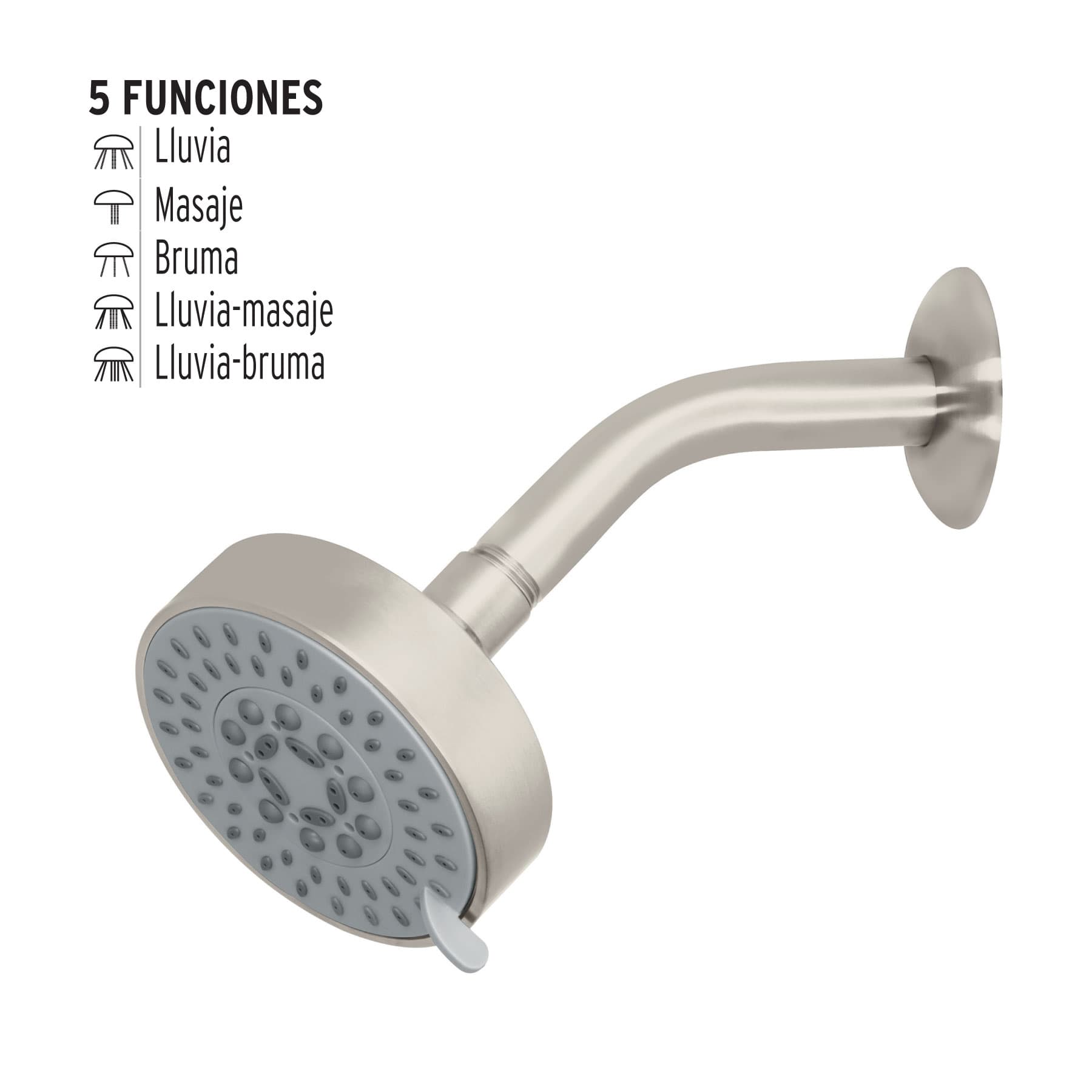 Regadera 5 funciones, con brazo, satín, Element