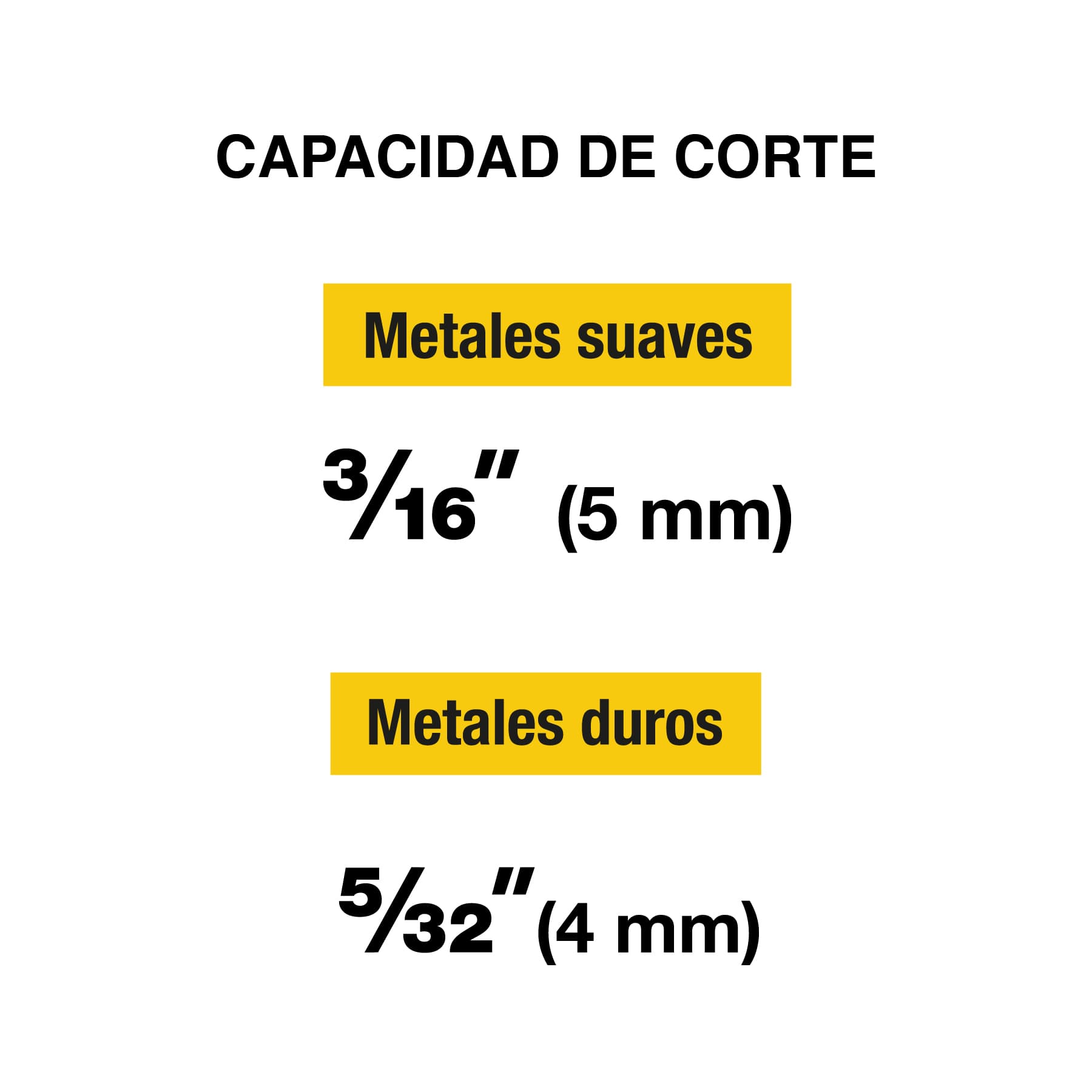 Capacidad máxima de corte | Materiales suaves 3/16" (4.7 mm), materiales duros 5/32" (4.0 mm) |