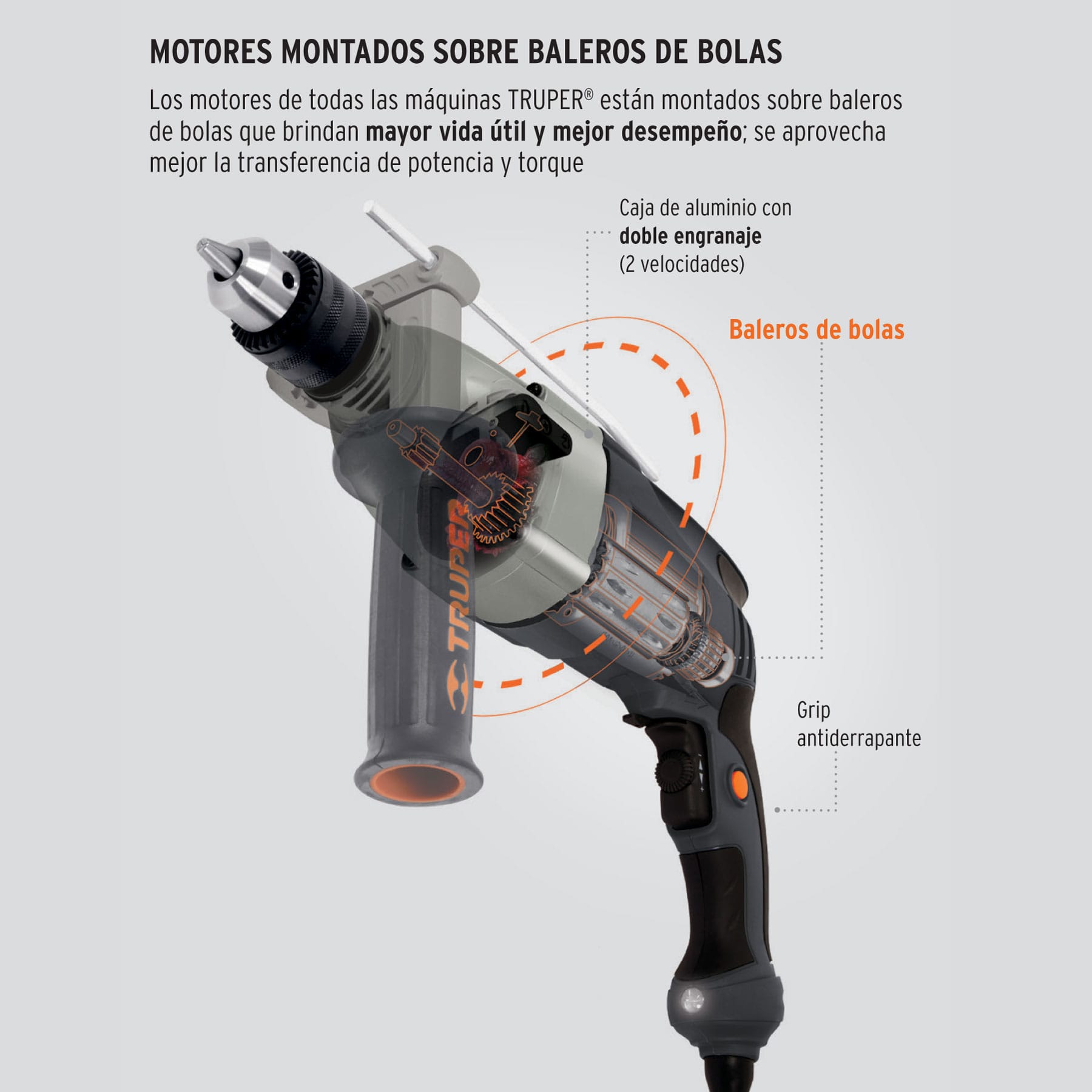 - Selector de función taladro o rotomartillo, con velocidad variable reversible