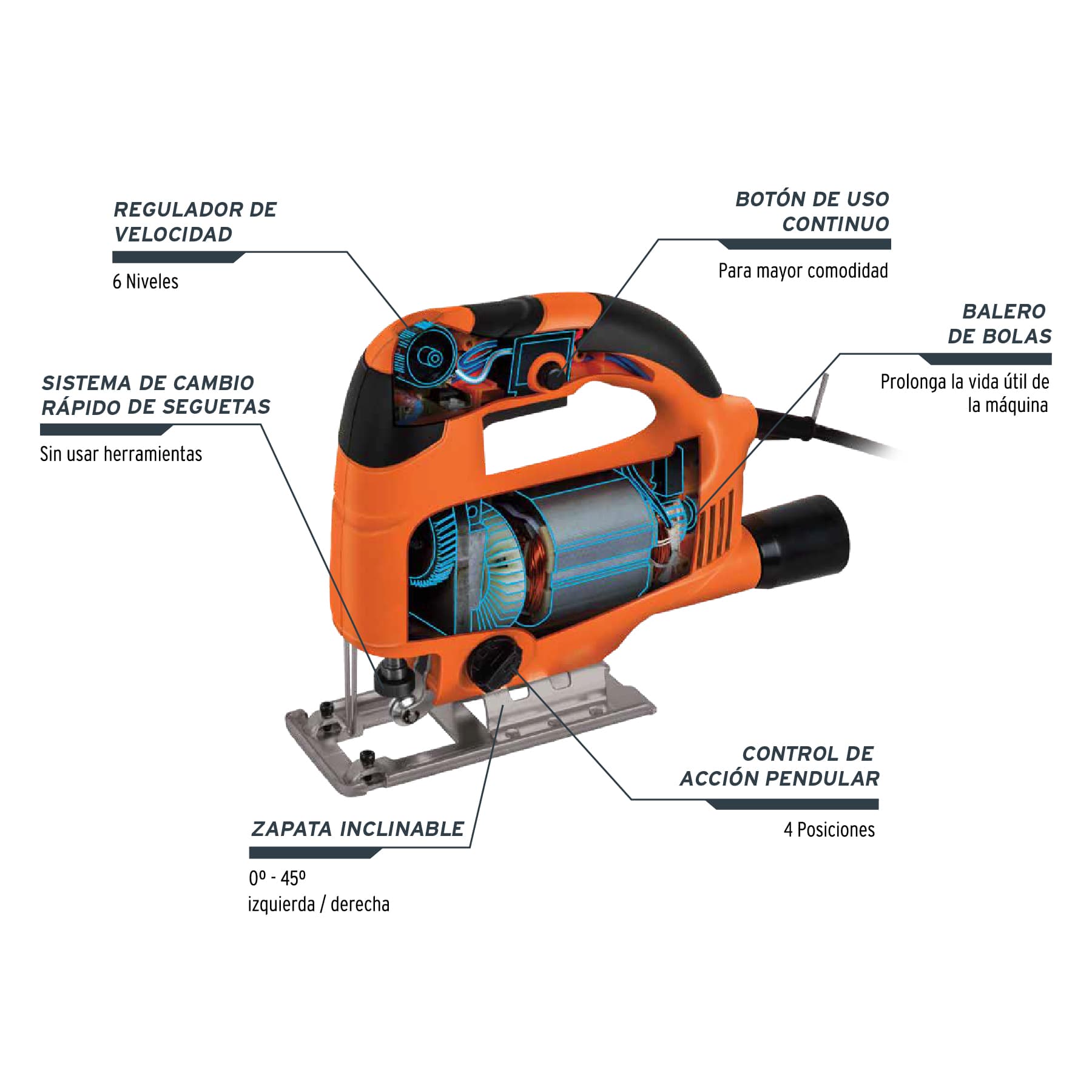 - Sistema de cambio rápido de segueta de ¼ de vuelta