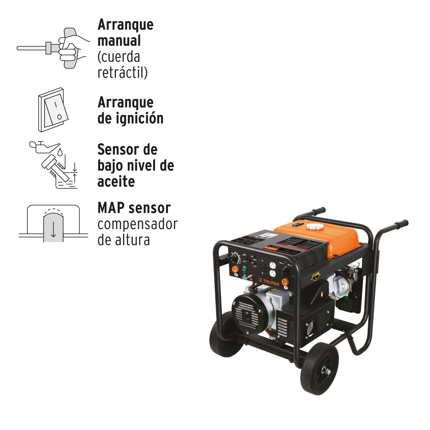 - Cuenta con depósito de combustible, manubrio ergonómico, chasis tubular de uso rudo y ruedas para transporte.