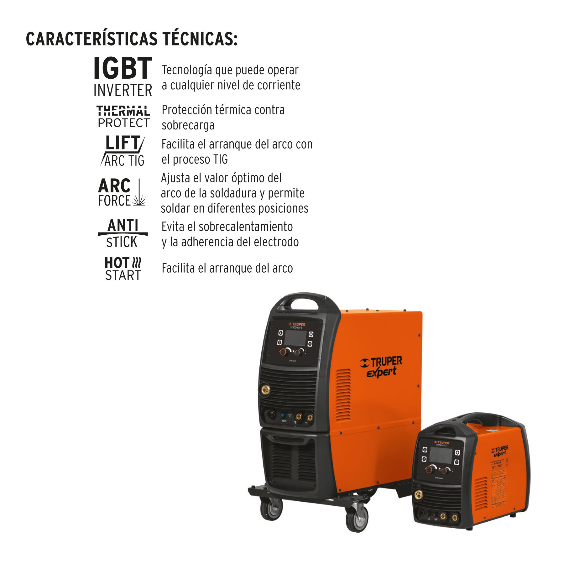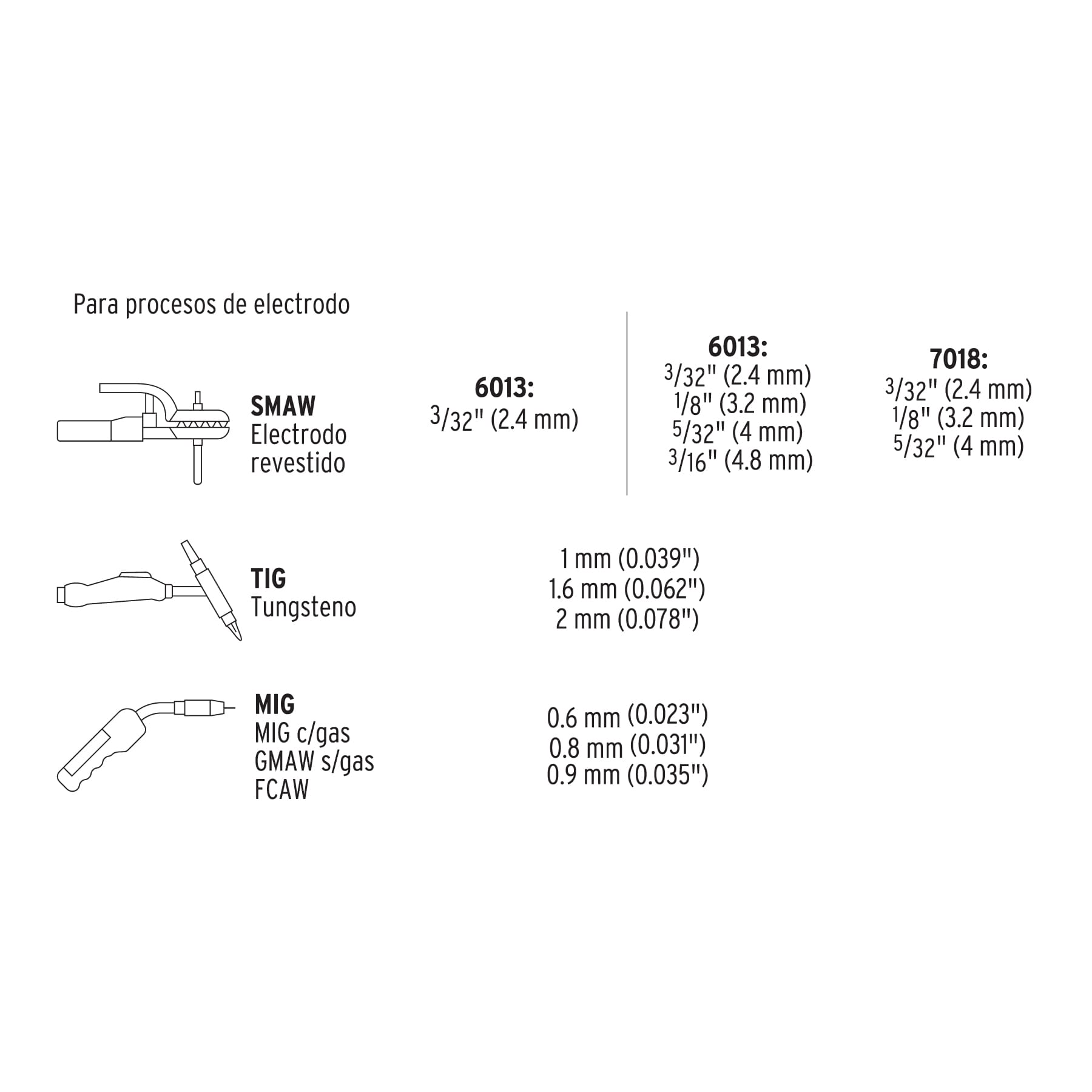 | Rango de corriente | 1 FASE, SMAW (10-70 A CD), TIG (10-90 A CD), MIG (10-90 A CD) 2 FASES, SMAW (10 - 180 A CD), TIG (10 - 180 A CD), MIG (10 - 200 A CD) |