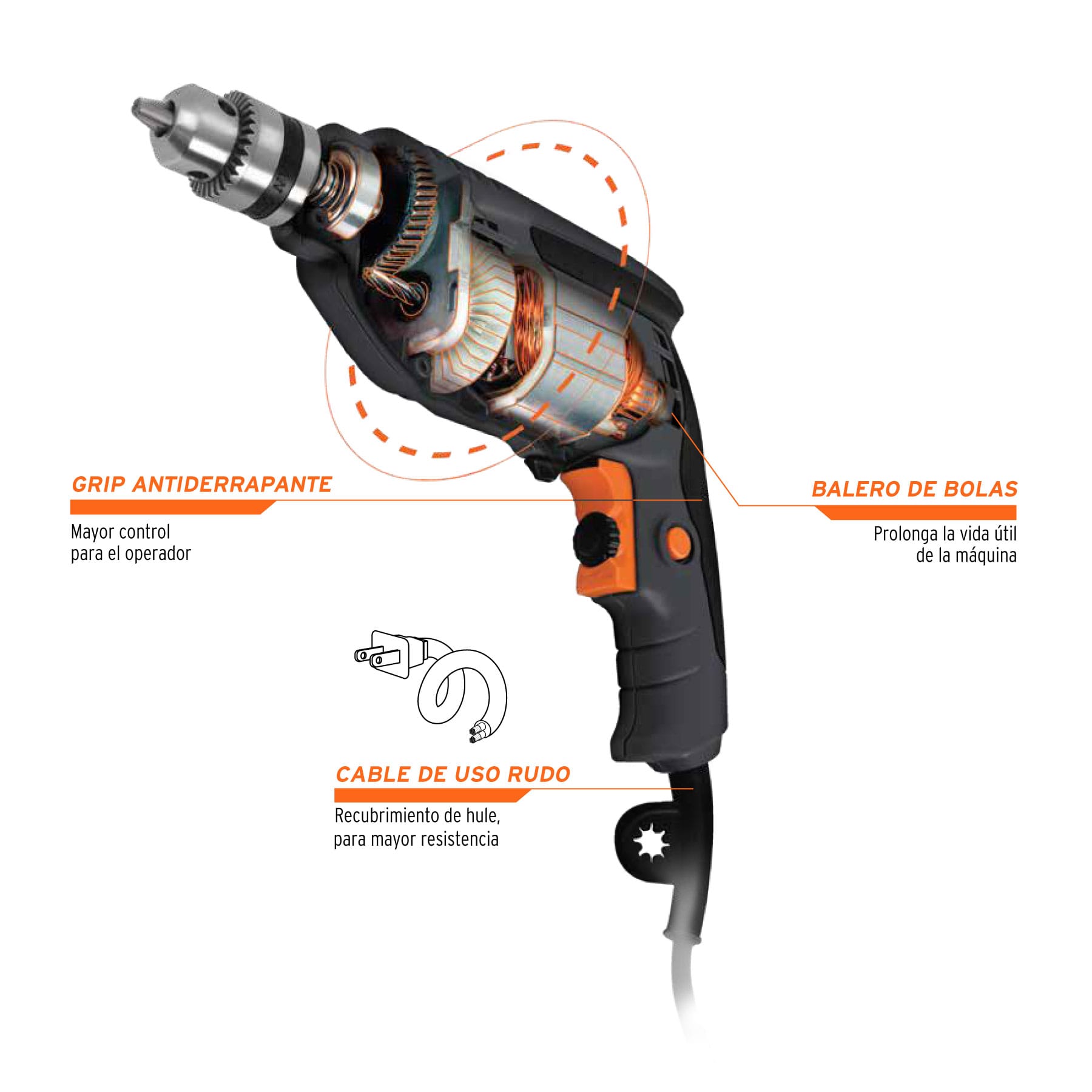 - Selector de rotación con velocidad variable reversible para un mayor control de la perforación